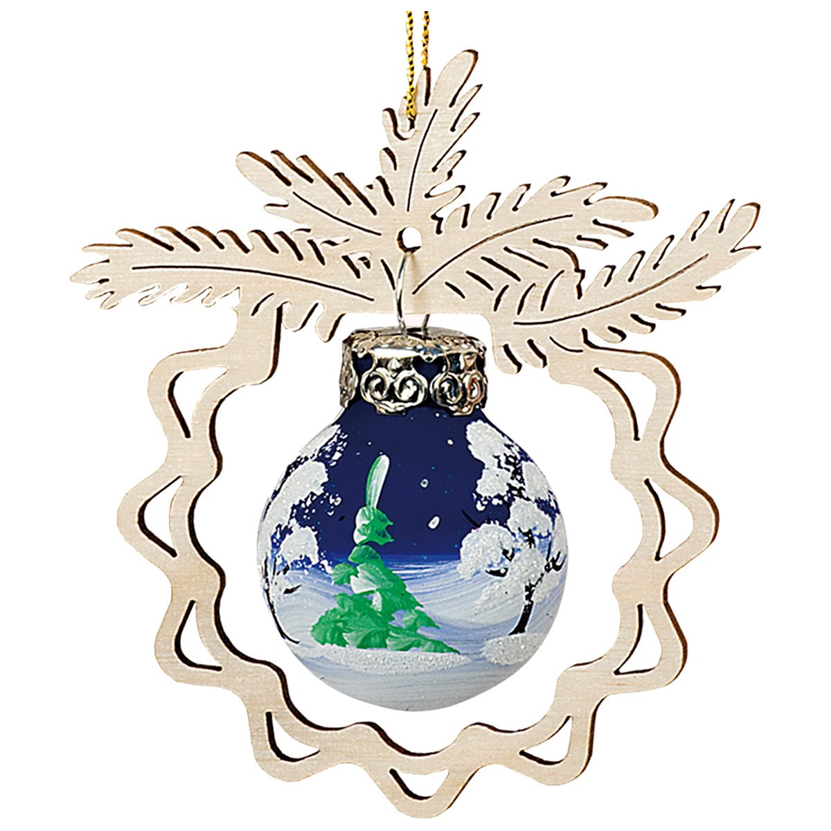 Glaskugeln, Strohsterne und Holzfiguren gehören als Christbaumschmuck an jeden Weihnachtsbaum. Hier präsentieren wir unseren Kunden eine besonders edle Variante des Christbaumschmucks. Ein hölzerner Kranz mit geschwungenen Linien umschließt eine feine Glaskugel. Jeweils eine eingearbeitete Öse dient als Aufhängung für die Kugel und den Holzkranz. Die Kugel ist mit einem winterlichen Motiv gefärbt. Die Farbgebung ist in weiß, grün, blau gehalten.