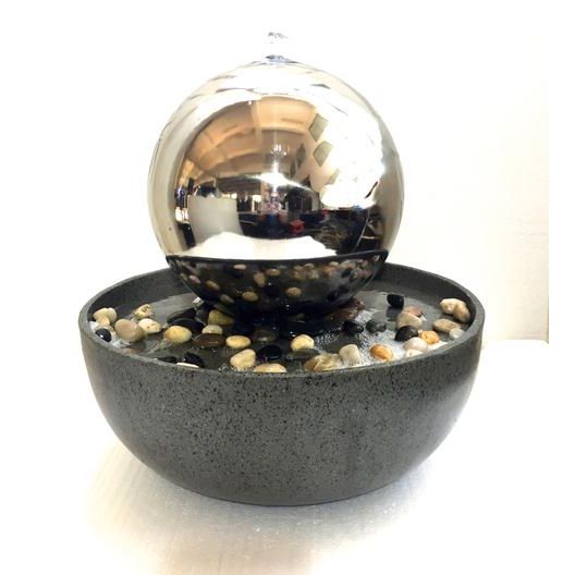 Dieser moderne Kugelbrunnen aus hochwertigem, poliertem Edelstahl kombiniert auf spektakuläre Weise das Wasser- mit dem Lichtspiel. Das helle, energiesparende LED-Licht sorgt bei Tag und bei Nacht für wunderschöne Akzente. Das Wasser fließt sanft plätzschernd über die Kugel, an deren Spitze die weiße LED-Bleuchtung sitzt. So wird der Brunnen zum Highlight Ihrer Ruheoase. Durch farblich sortierte Kieselsteine auf der Wasseroberfläche des Sockels (aus leichtem Kunstharz) wird die naturnahe Optik unterstrichen und lässt an einen natürlichen Bachlauf erinnern.