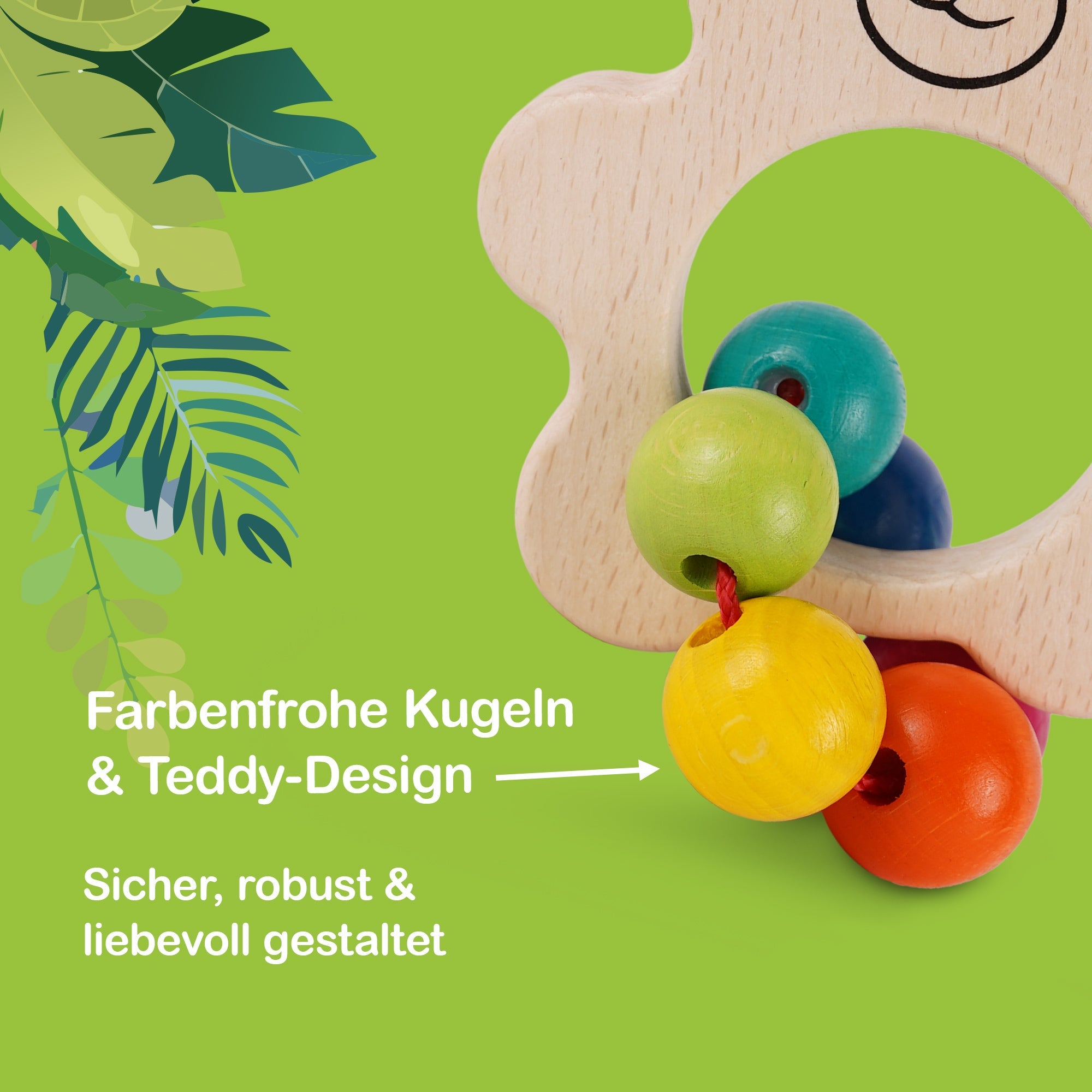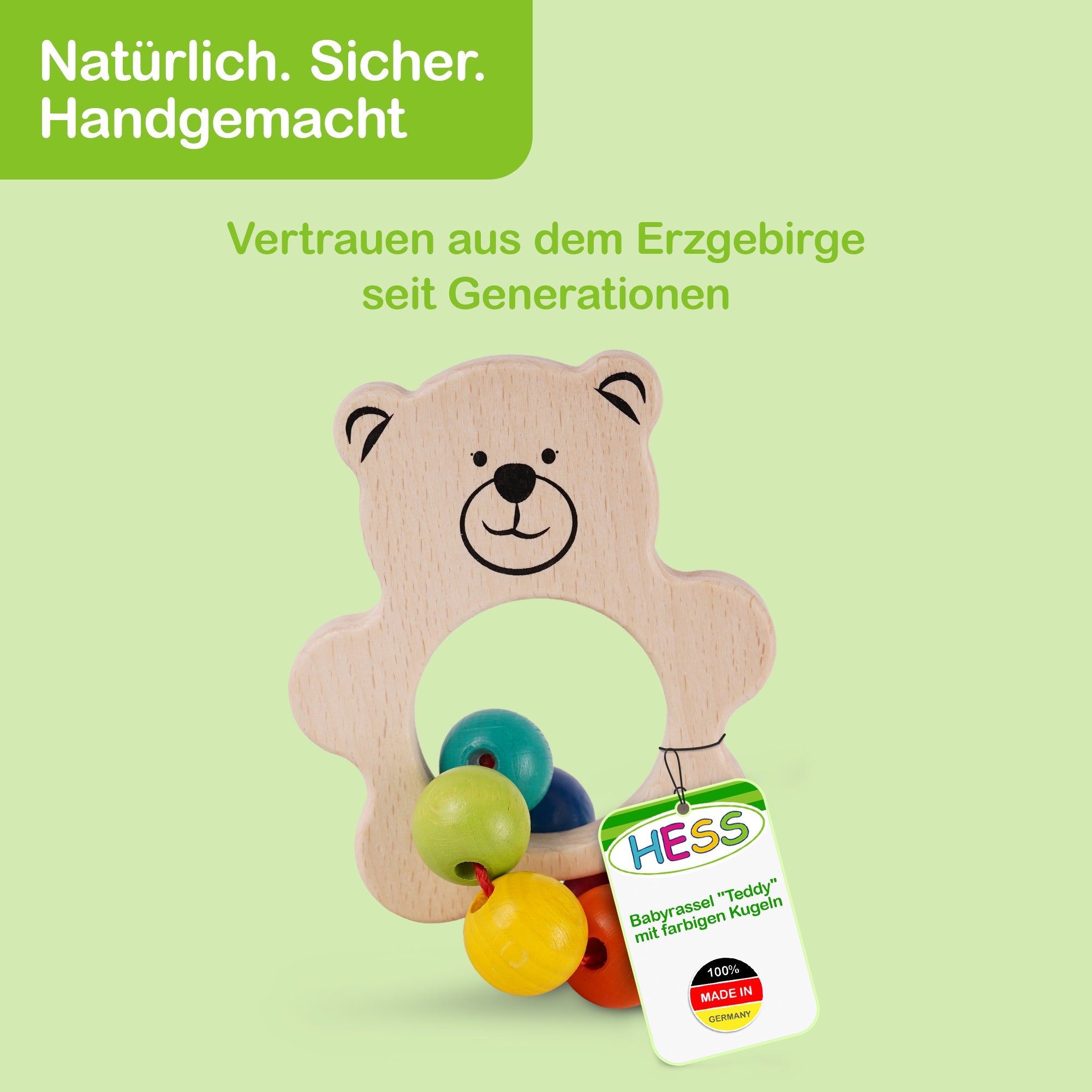 Gefertigt aus hochwertigem Holz im Erzgebirge in Deutschland, überzeugt die Rassel durch ihre Langlebigkeit und sichere Verarbeitung. Die farbenfrohen Kugeln sind mit wasserbasierten Farben bemalt und somit völlig unbedenklich für Ihr Kind. Die unbehandelten Holzelemente bieten eine natürliche Spielumgebung und halten auch intensiven Spielphasen stand.