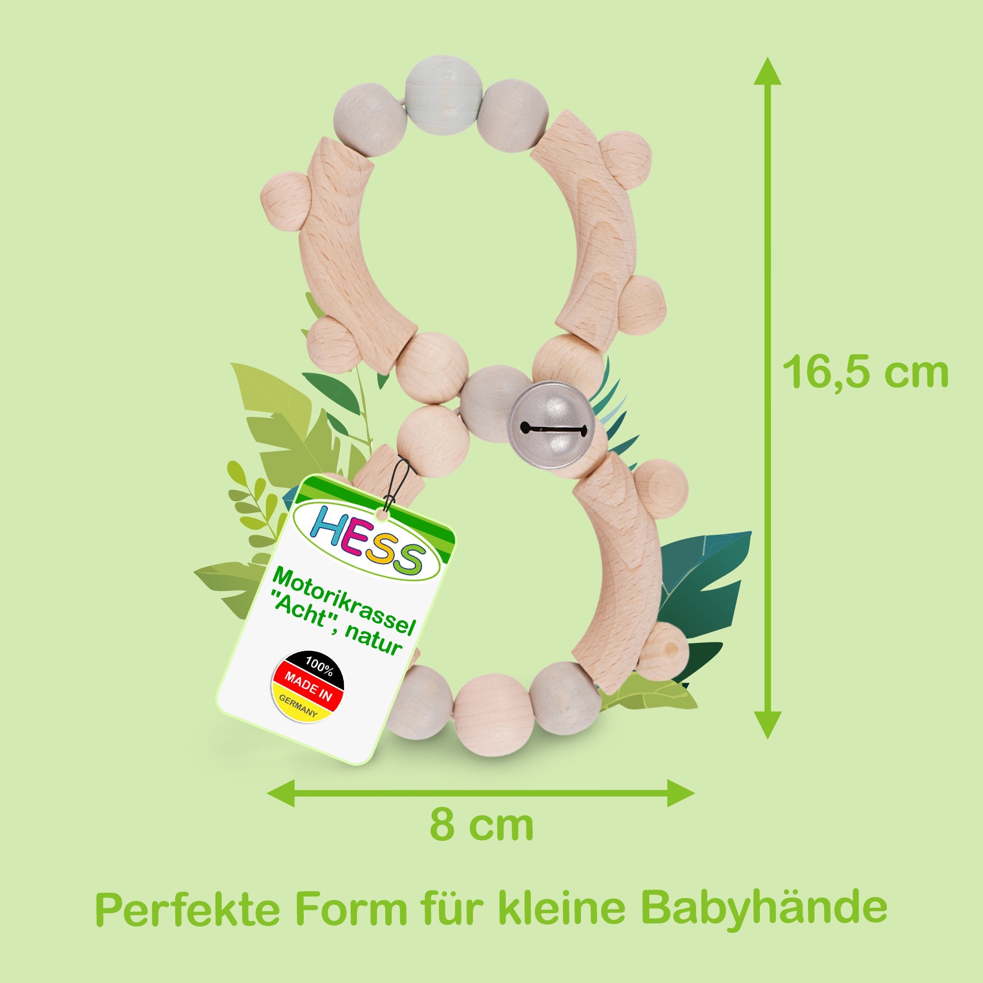 Die Motorikrassel "Acht" ist ein hochwertiges Spielzeug, das speziell dafür entwickelt wurde, die motorischen Fähigkeiten Ihres Babys zu fördern. Mit einer Größe von 8 cm x 2 cm x 14 cm ist sie perfekt für kleine Hände und unterstützt Ihr Kind beim ersten Tasten und Ergreifen. Diese farbenfrohe und kindgerechte Holzrassel wird in Deutschland, genauer gesagt im Erzgebirge, hergestellt und bietet höchste Qualität und Sicherheit.