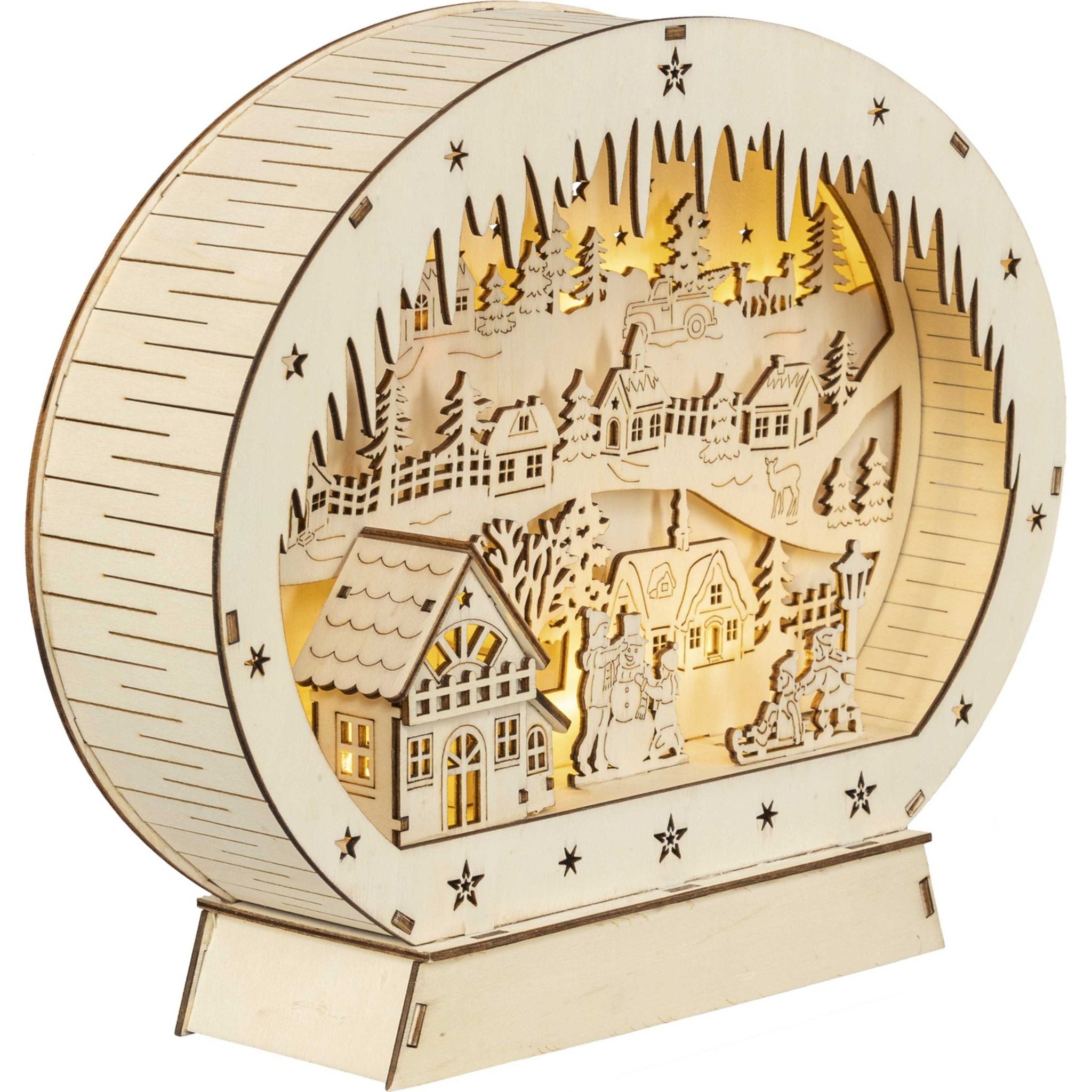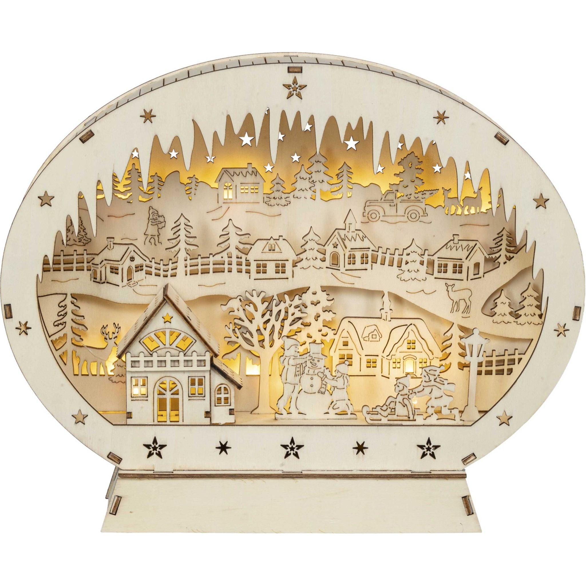 Das LED-Diorama "Winter in der Stadt" ist ein stimmungsvolles Deko-Element für Ihr Zuhause. Die beleuchtete Stadtlandschaft sorgt für eine behagliche Atmosphäre in Ihrem Wohnzimmer. Das Diorama ist aus hochwertigen Materialien gefertigt und wird mit Batterien betrieben. Ein Timer sorgt dafür, dass die LED-Beleuchtung automatisch nach einer bestimmten Zeit (6 Stunden) ausgeschaltet wird. Das Diorama ist 45 x 10 x 35,5 cm groß und eignet sich perfekt als Geschenk oder als Dekoration für Ihren Wintergarten.