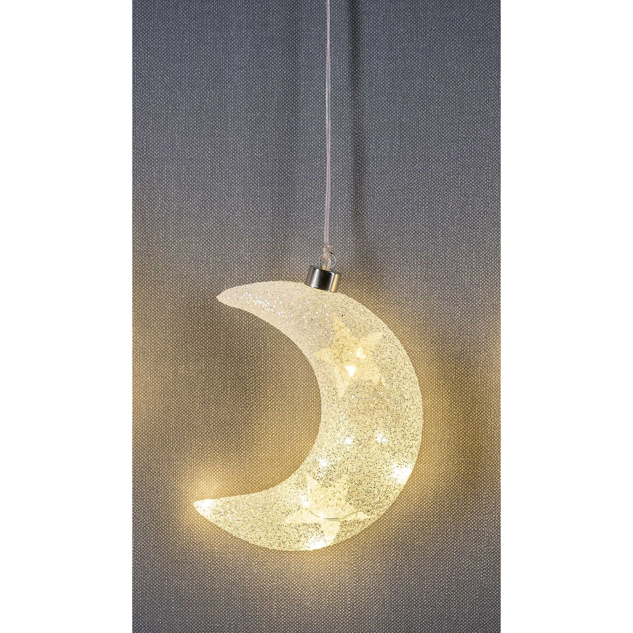 Dieser kleine LED Mond aus Glas mit einer Höhe von 18 cm kann Ihre Weihnachtsdekoration ergänzen. Er verfügt über einen silberfarbenen Aufhänger, der gleichzeitig als Batteriefach dient. Zudem verfügt der Mond über eine integrierte Timerfunktion.