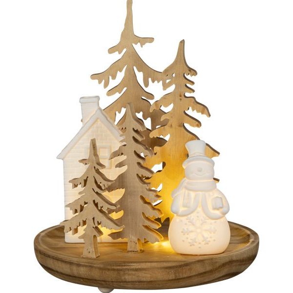 LED Holz-Arrangement mit Keramikfiguren – stimmungsvolle Winterdeko auf 24 cm Holzsockel
