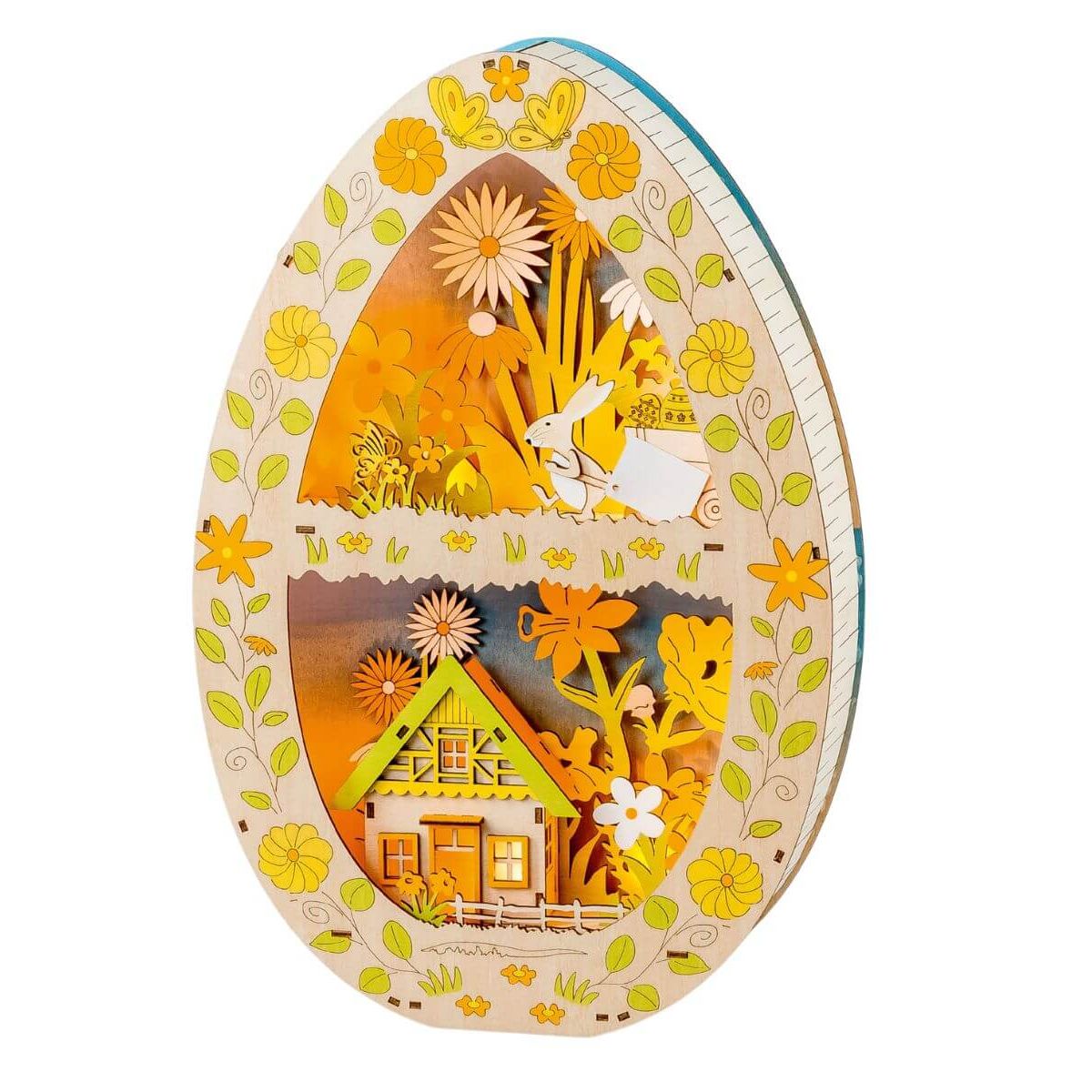Dieses XL-Oster-Diorama aus Holz in Form eines Ostereies ist nicht nur ein dekoratives Highlight, sondern auch eine stimmungsvolle Beleuchtungsidee für die Osterzeit. Mit einer Höhe von 45 cm fällt das Diorama sofort ins Auge und verbreitet eine festliche Atmosphäre im Raum. Die warmweiße LED-Beleuchtung, betrieben mit Batterien, sorgt zudem für gemütliches Licht und trägt zur feierlichen Stimmung bei. Machen Sie Ihr Zuhause mit diesem hochwertigen Dekorationsstück zu Ostern zu einem echten Hingucker!