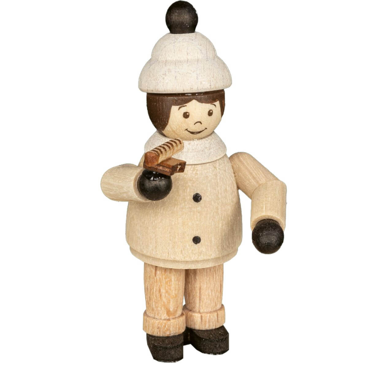 Das Miniatur Mädchen mit Bratwurst ist ein charmantes Sammlerstück, das die Freude des traditionellen Genusses in einer kompakten Größe von 5 cm einfängt. Diese Figur, die in natürlichen Farben gehalten ist, bringt die Gemütlichkeit und den Charme des Erzgebirges in Ihr Zuhause.