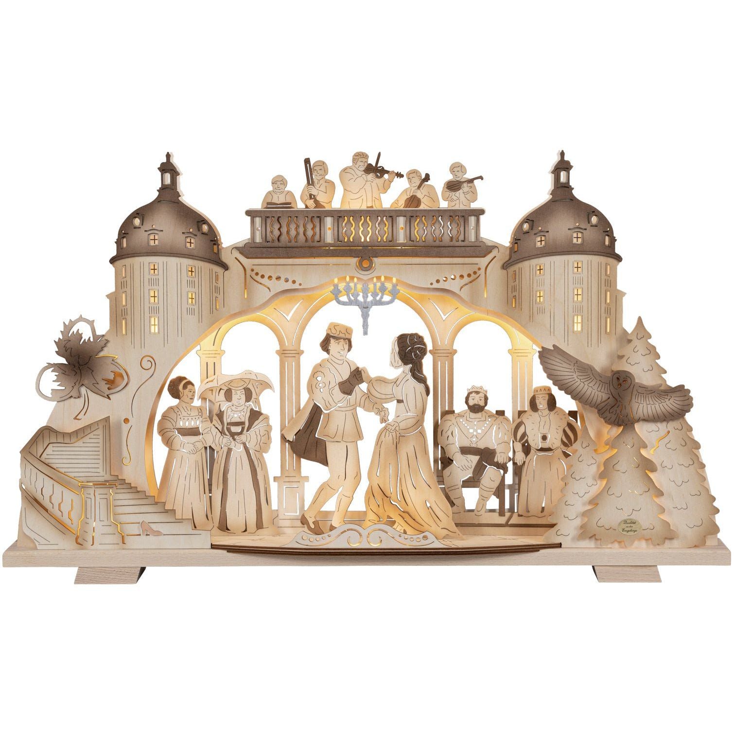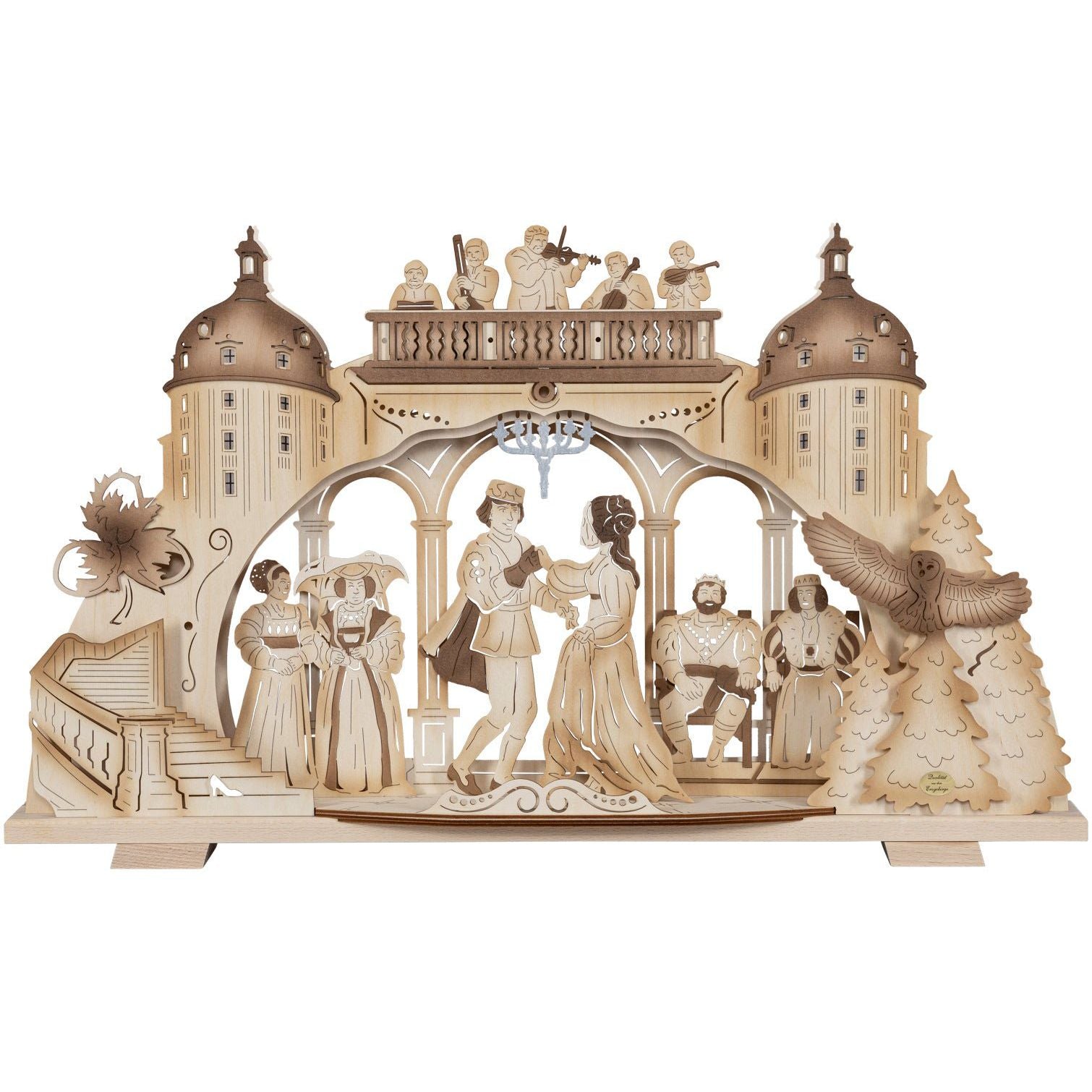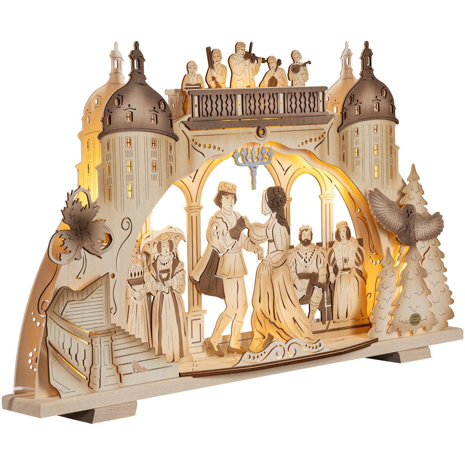 Die festliche Atmosphäre des Schwibbogens, der aus hochwertigem Holz gefertigt ist, wird durch die LED-Stripe-Beleuchtung noch verstärkt. Im Vordergrund sind Aschenbrödel und der Prinz zu sehen, während im Hintergrund der König mit der Königin sowie die Stiefmutter mit der Stiefschwester erscheinen. Diese liebevoll gestalteten Details machen den Schwibbogen zu einem echten Blickfang.