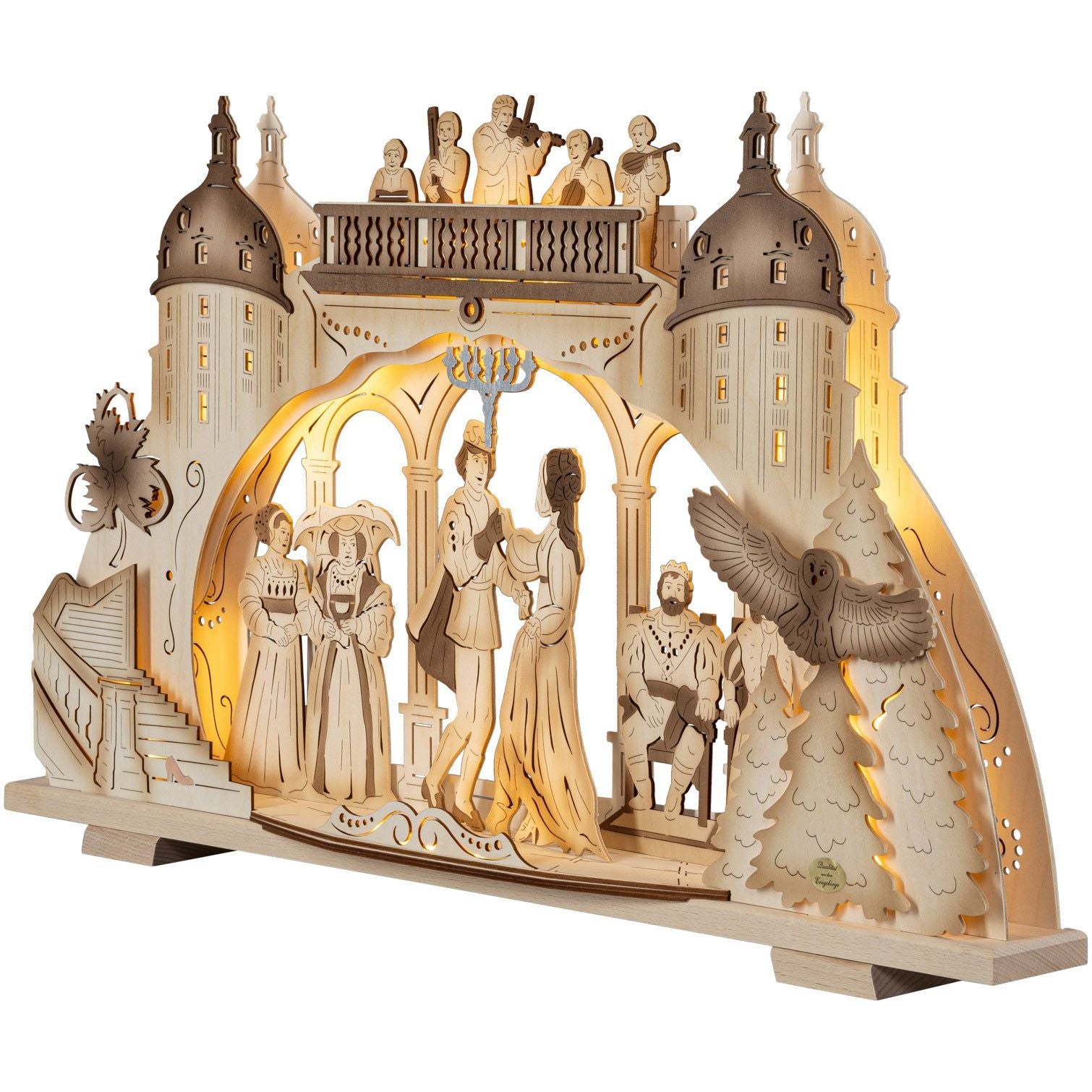 Über allem thront die Kapelle, flankiert von zwei Türmen des Schlosses Moritzburg. Ein wahrhaft königlicher Anblick für jeden Betrachter! Hergestellt im Erzgebirge, erfüllt dieser schöne Schwibbogen allerhöchste Qualitätsstandards.
