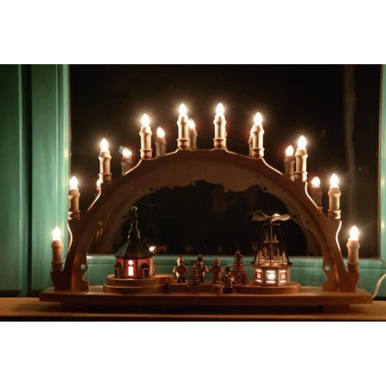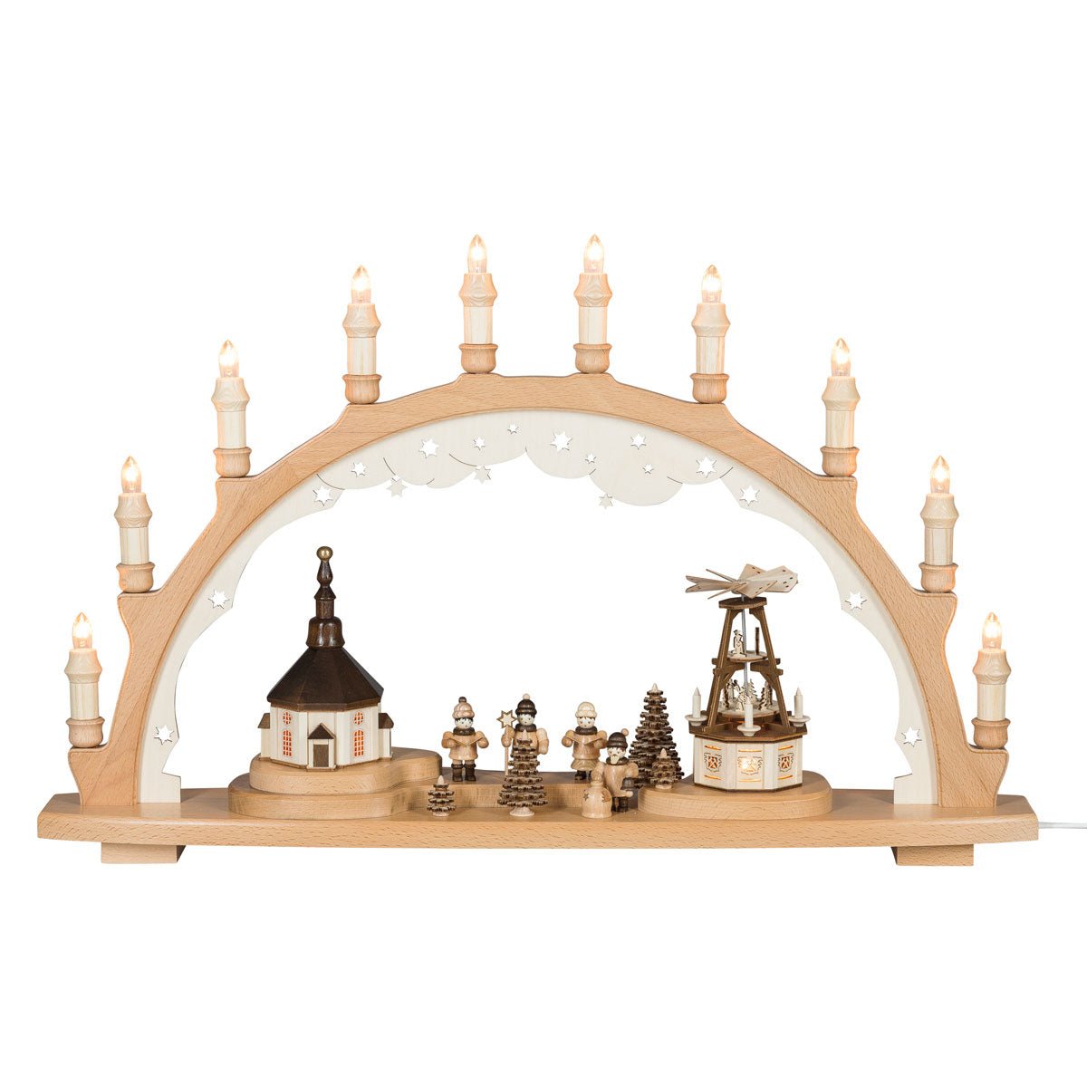 Bei diesem ganz besonderen Schwibbogen glänzen nicht nur die 10 elektrischen LED-Kerzen. Auch die Miniatur der berühmten Seiffener Kirche und die kleine Pyramide sind beleuchtet. Eine dreiköpfige Kurende unterstützt den Weihnachtsmann beim Verteilen der Geschenke auf dem Seiffener Weihnachtsmarkt. Vier kunstvoll gefertigte Nadelbäumchen ergänzen die liebevolle Szene unter dem nächtlichen Sternenhimmel. Durch die besondere Tiefe ist der Schwibbogen besonders für breite Fensterbänke oder Kommoden geeignet. Bitte den Schwibbogen nicht im Außenbereich aufstellen! Bei diesem Produkt handelt es sich um ein Original aus dem Erzgebirge, "Made in Germany"! Der Schwibbogen ist für den Netzstrom ausgelegt.