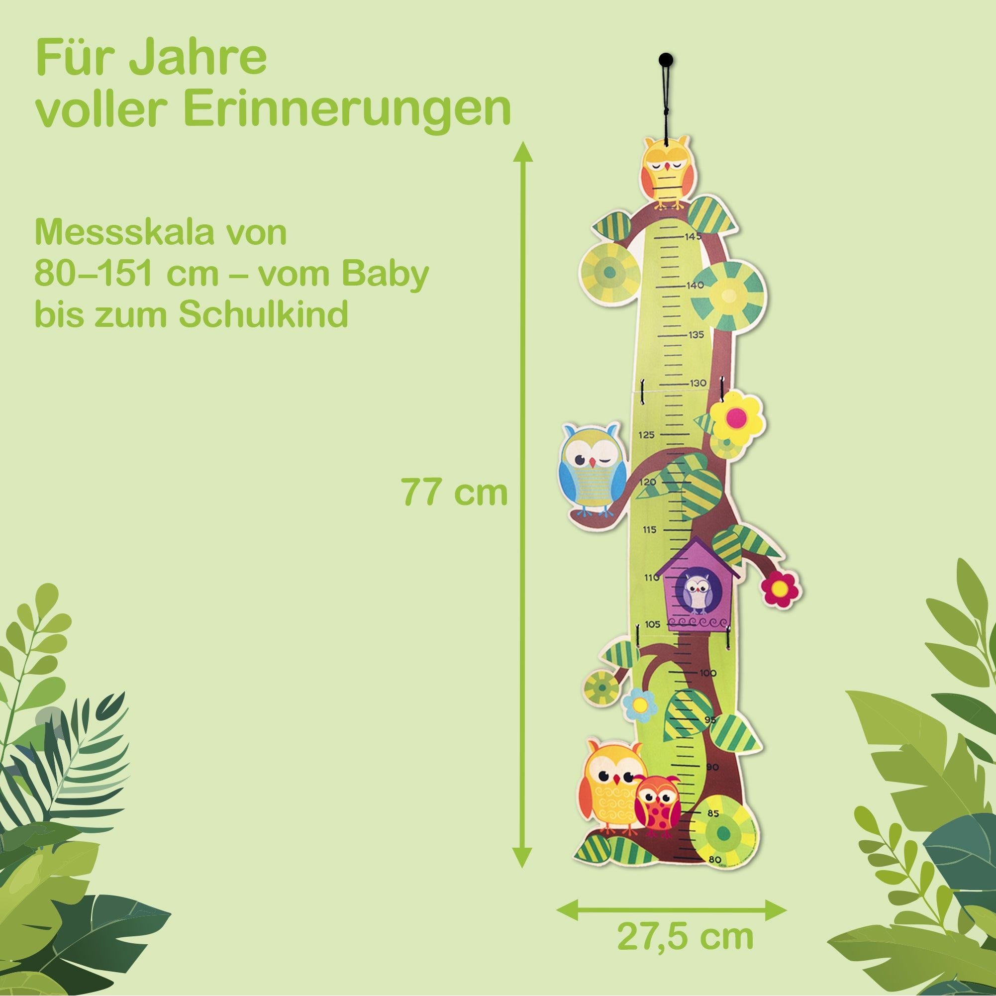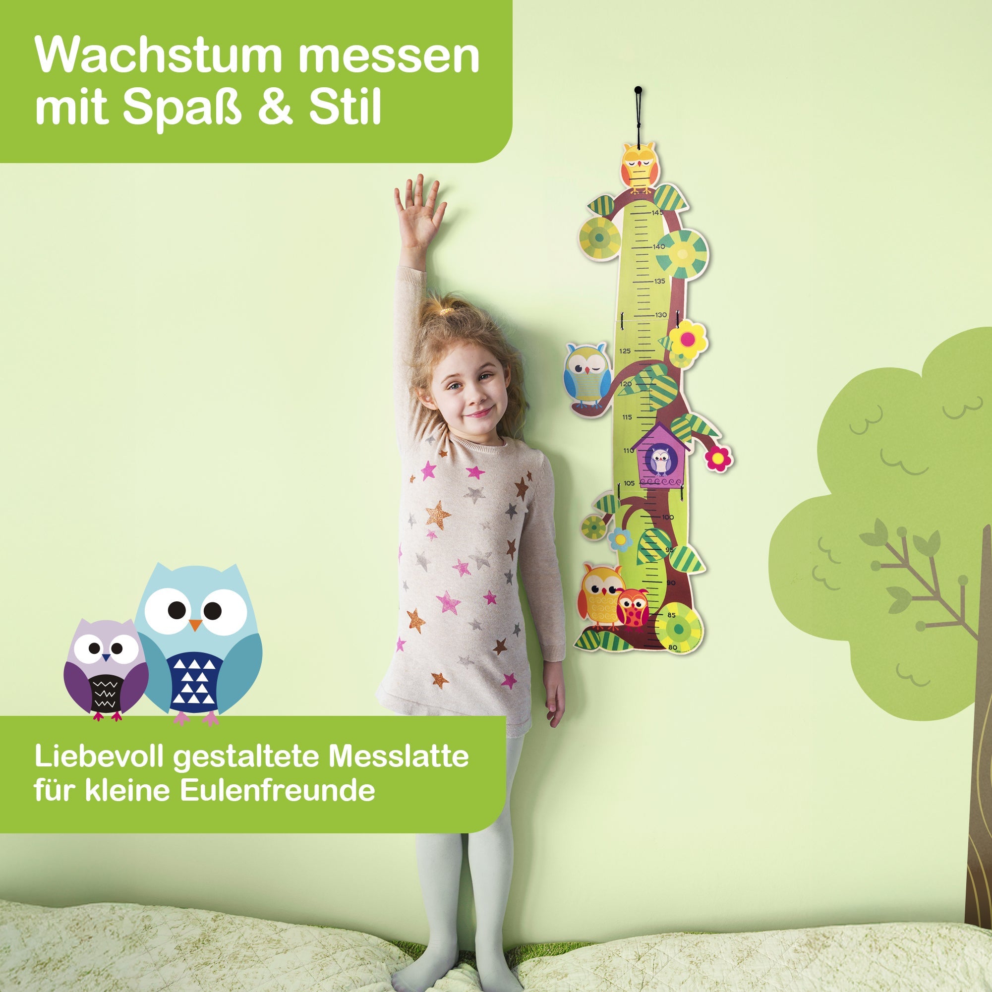Die Messlatte "Eulen" ist das ideale Accessoire für alle, die Eulen lieben und das Wachstum ihres Kindes mit Stil dokumentieren möchten. Mit niedlichen Eulenmotiven gestaltet, wird das Messen der Körpergröße zu einem fröhlichen Ritual im Alltag. Die farbenfrohe Gestaltung bringt Wärme und Persönlichkeit ins Kinderzimmer und macht die Messlatte zu einem echten Blickfang.