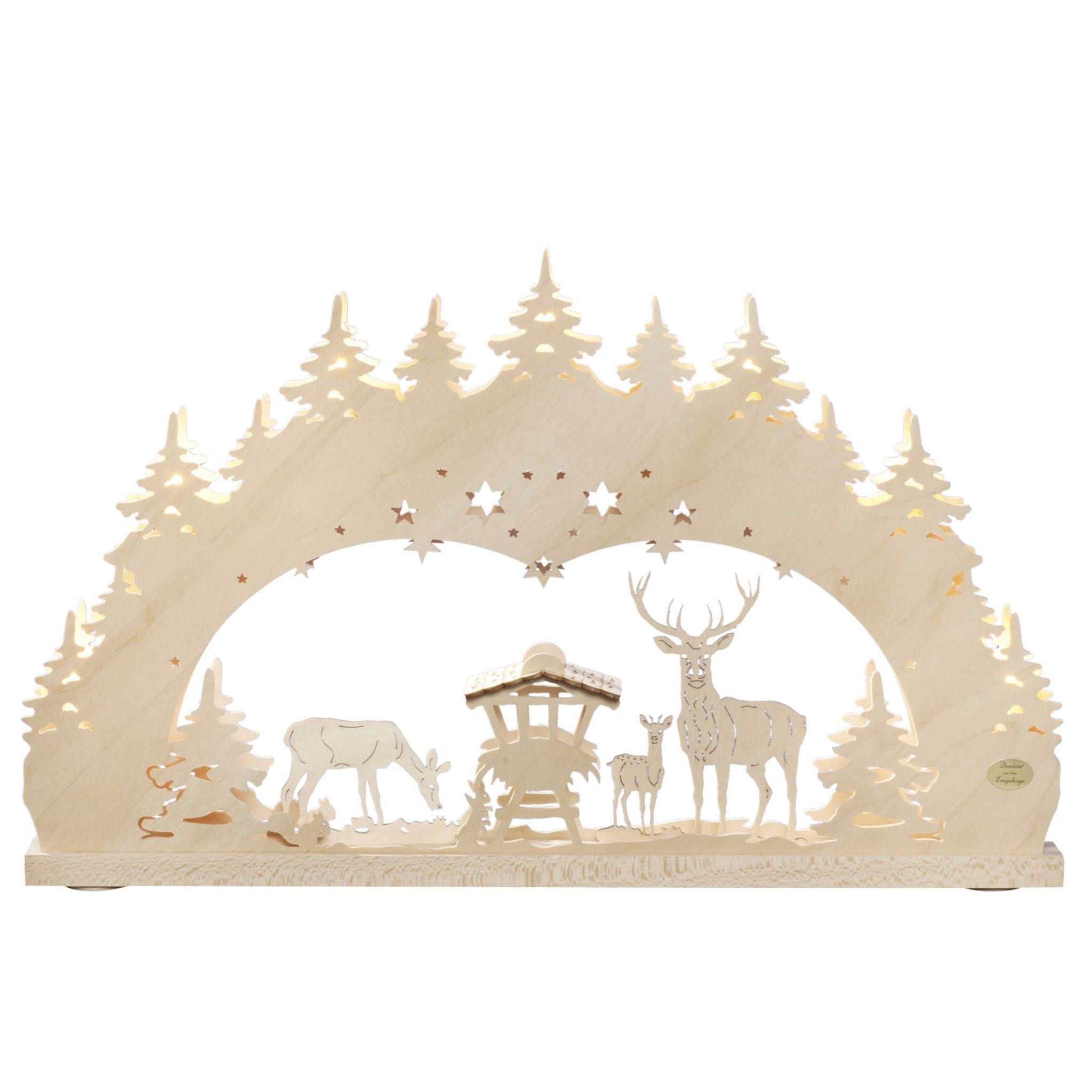 Der LED Schwibbogen "Wald" ist ein liebevoll gestaltetes Stück erzgebirgischer Holzkunst, das mit seinem Waldmotiv mit Rehen und Hirsch eine besonders naturnahe Atmosphäre schafft. Der ausgeprägte 3D-Effekt verleiht dem Motiv Tiefe und macht es zu einem echten Blickfang – ideal für alle, die eine ruhige, besinnliche Weihnachtsdekoration bevorzugen.