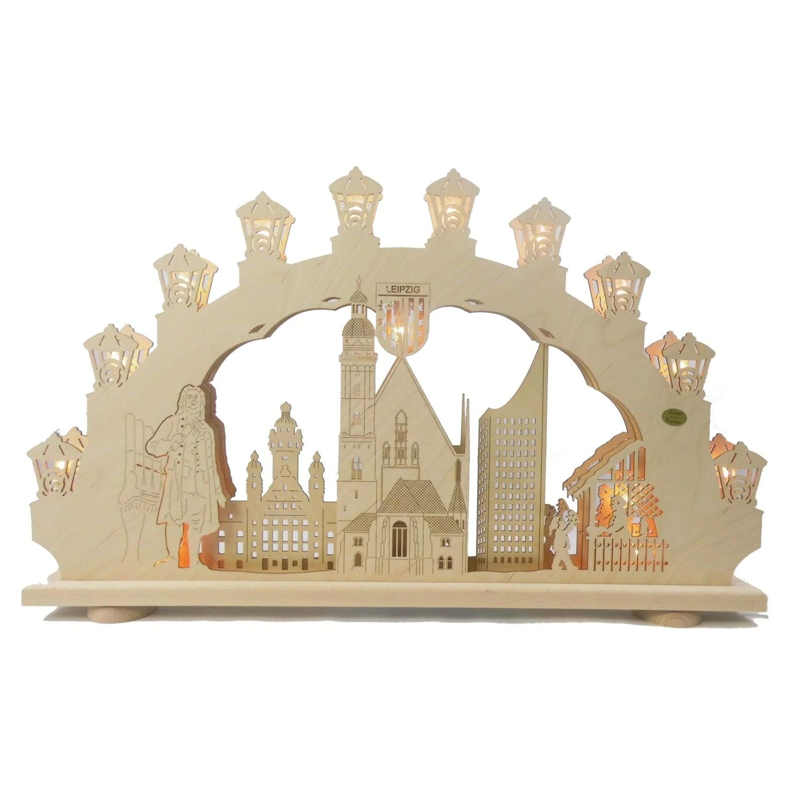 Unser 3D-Premium-LED-Lichterbogen "Leipzig" von SAICO GmbH Seiffen ist 15-flammig und hat eine schöne indirekte Beleuchtung, um eine angenehme Stimmung zu erzeugen. Das Stadt-Motiv an sich ist schon sehr schön, perfekt gestaltet wird es bei diesem Schwibbogen jedoch durch die vielen schönen Details der Stadt "Leipzig".