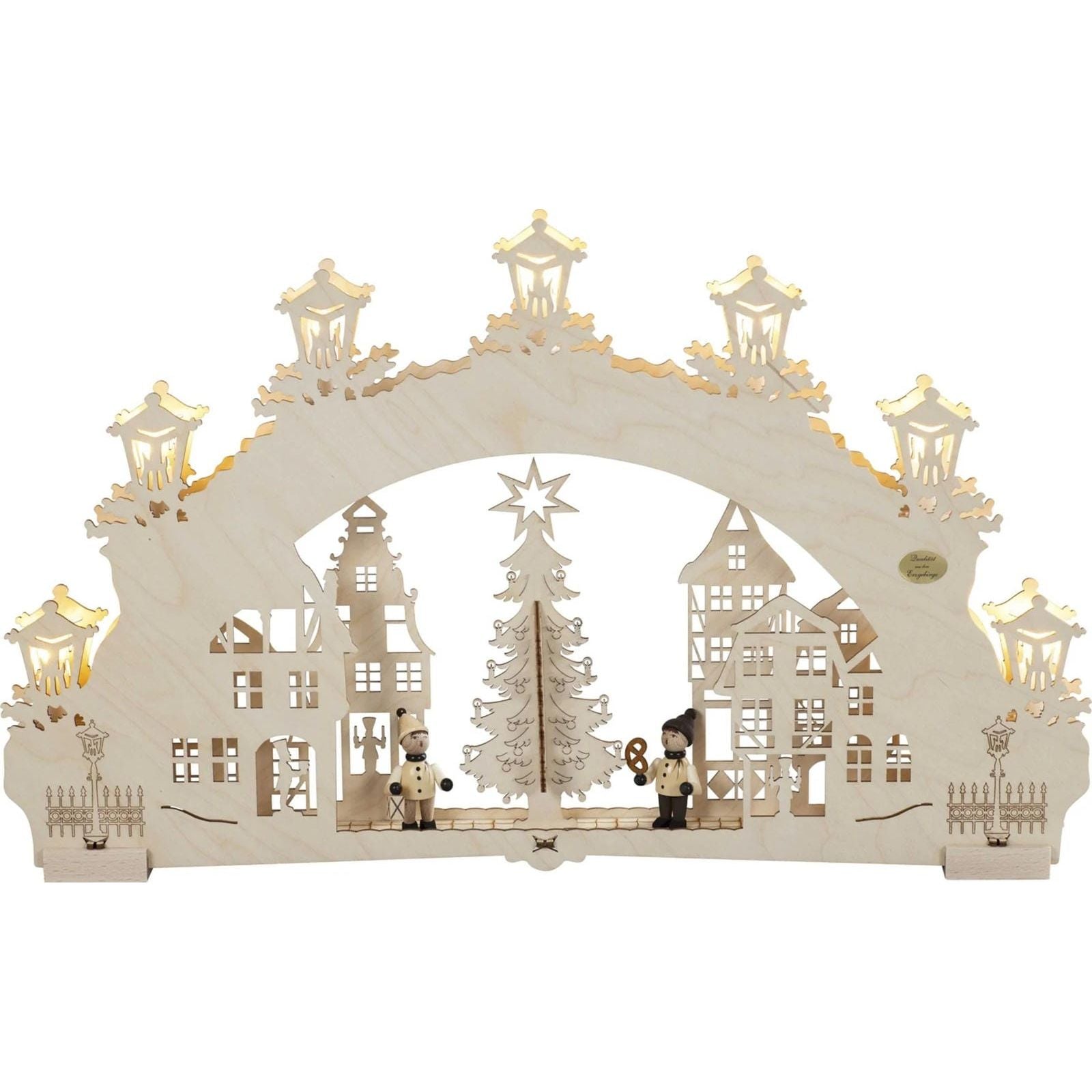 Die 7-flammige LED-Beleuchtung sorgt für eine gleichmäßige, warme Ausleuchtung, die das Motiv lebendig wirken lässt. Dank des Trafos mit Timer-Funktion lässt sich die Beleuchtung bequem steuern – für mehr Komfort und Energieeffizienz. Der Schwibbogen „Weihnachtsmarkt“ vereint traditionelle Holzkunst mit moderner Technik für eine stimmungsvolle Weihnachtszeit.