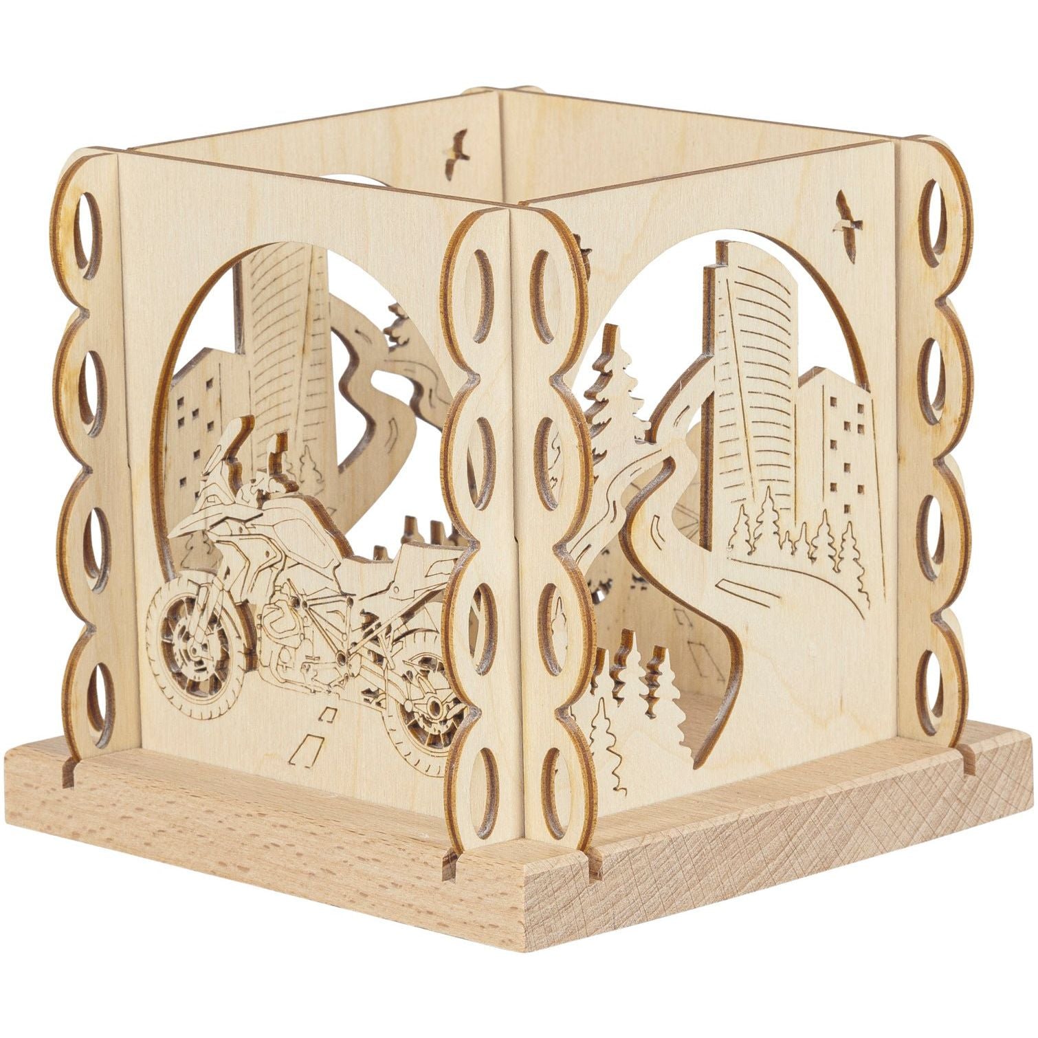 Der Kerzenhalter "Motorradfreund" ist die perfekte Dekoration für alle Motorradliebhaber. Gefertigt aus natürlichem Holz, zeigt er auf seinen vier Seiten ein detailreiches Motorrad, eine stilisierte Straße, die Skyline einer Stadt und Bäume. Die gegenüberliegenden Motive erzeugen eine dynamische Szene, die durch das warme Licht eines Teelichts besonders stimmungsvoll zur Geltung kommt – ideal für Wohnzimmer, Werkstatt oder als Geschenk für echte Biker.
