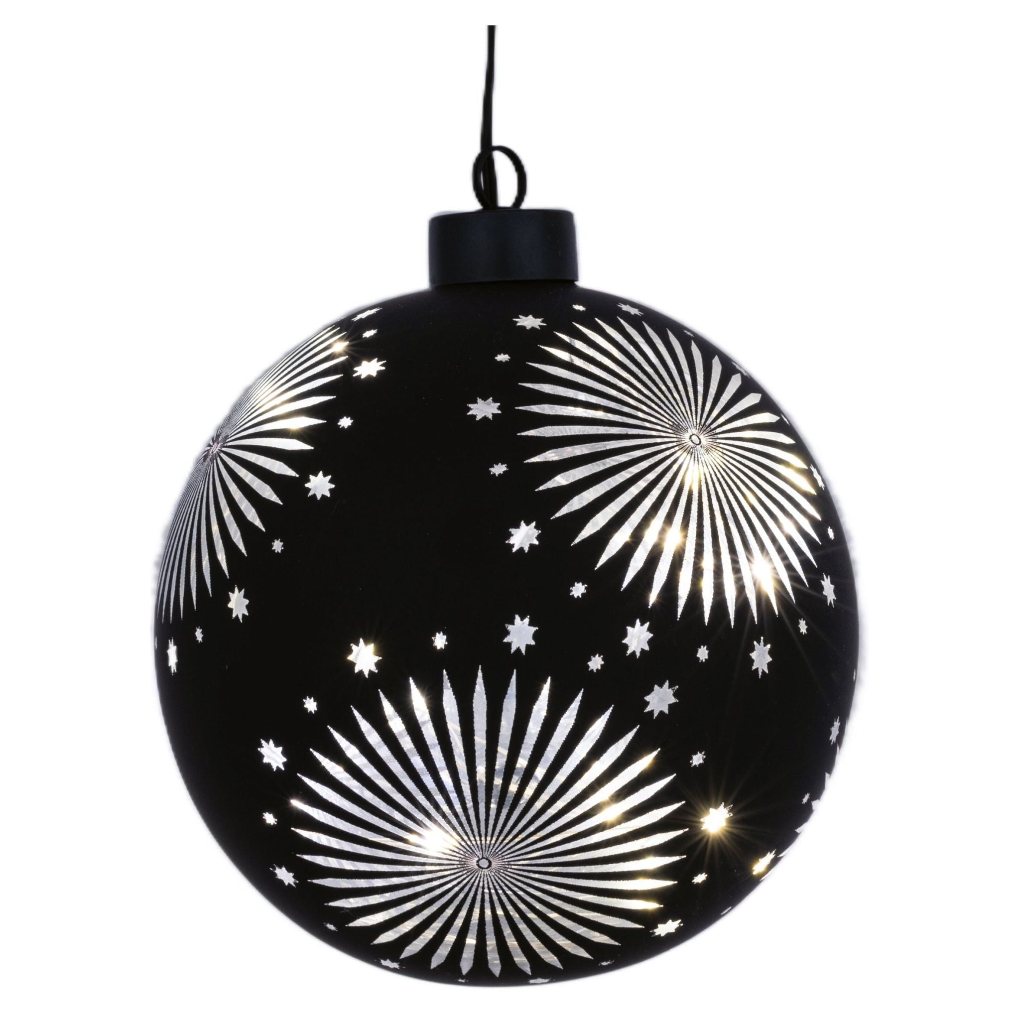 Die LED Glaskugel Satin-Schwarz ist eine elegante Hängedekoration mit modernem Charakter. Mit einer Höhe von 13 cm und einer matten, satinierten Oberfläche in tiefem Schwarz wirkt sie besonders edel. Durch sternförmige Aussparungen scheint das Licht der integrierten LEDs nach außen und erzeugt ein faszinierendes Leuchtspiel.