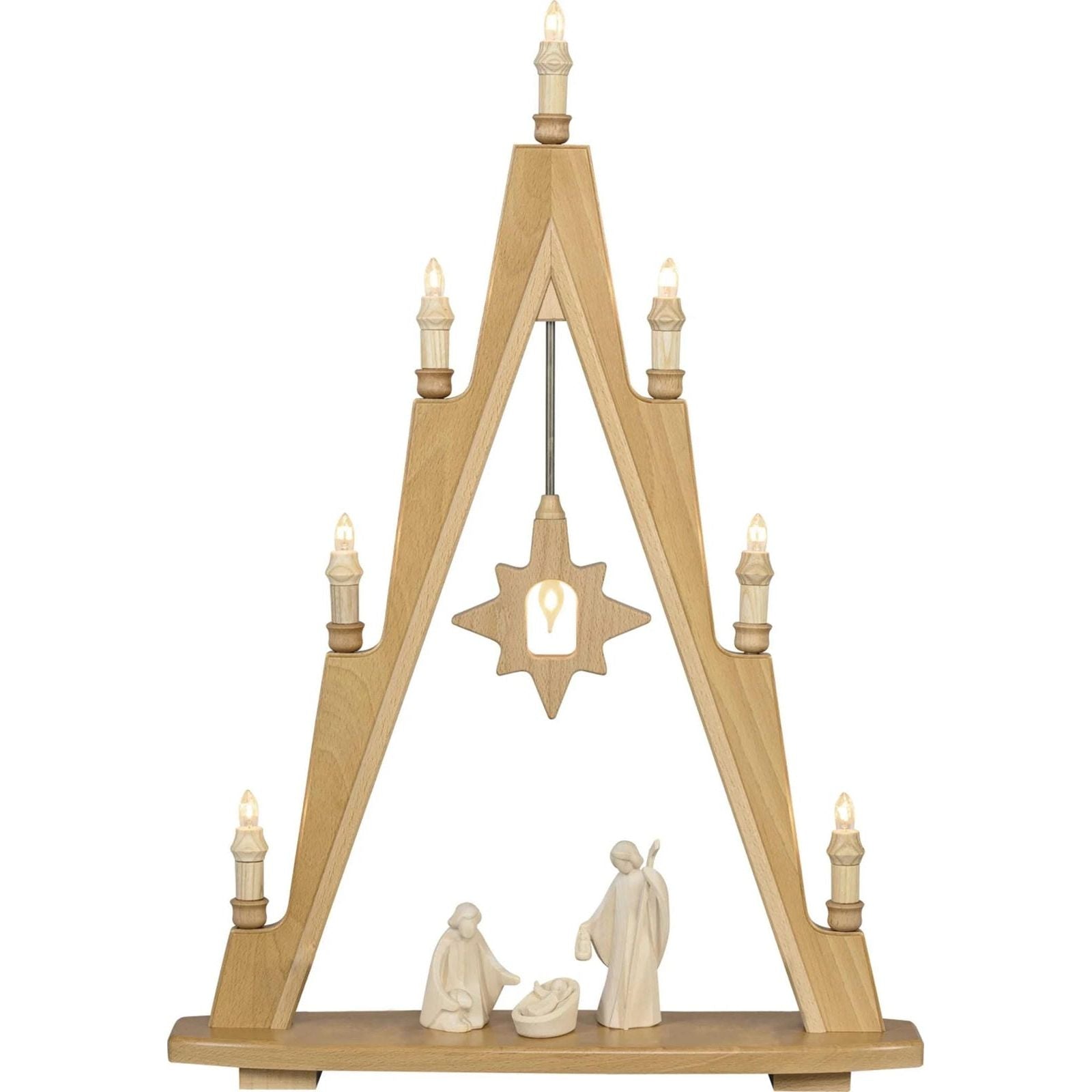 Die naturfarben gehaltene Figurengruppe aus Südtirol zeigt die Heilige Familie in liebevollen Details. Der Holzrahmen, gefertigt im Erzgebirge, verbindet traditionelle Handwerkskunst mit zeitgemäßem Design. Wie der passende Adventsstern besteht auch die Lichterspitze aus hochwertigem Holz und überzeugt durch ihre stabile Verarbeitung.