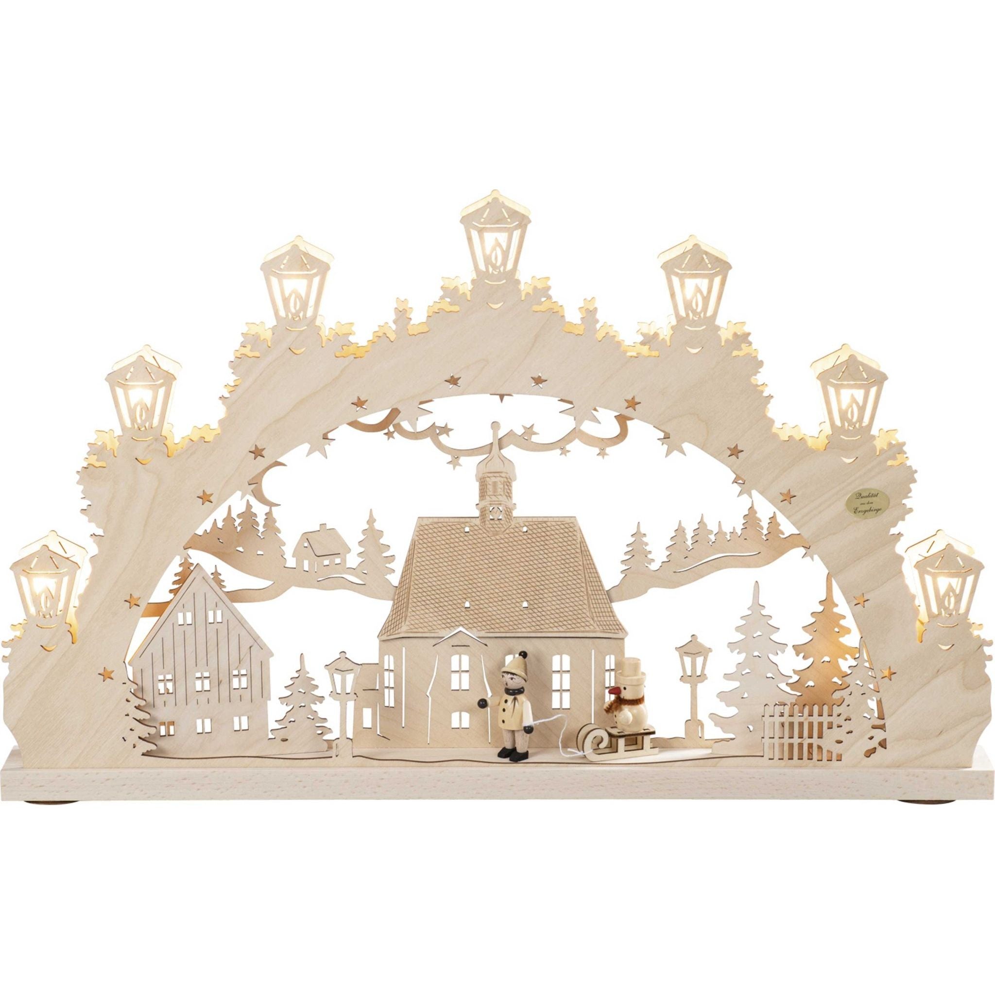 Die 7-flammige LED-Beleuchtung ist indirekt verblendet und sorgt für einen wundervollen Lichtschein am Abend. Gefertigt im Erzgebirge, steht dieser Schwibbogen für traditionelle Handwerkskunst und hohe Qualität. Der Schwibbogen „Kind mit Schlitten“ ist ein liebevoll gestaltetes Dekorationsstück, das Wärme und Gemütlichkeit in Ihre Weihnachtszeit bringt.