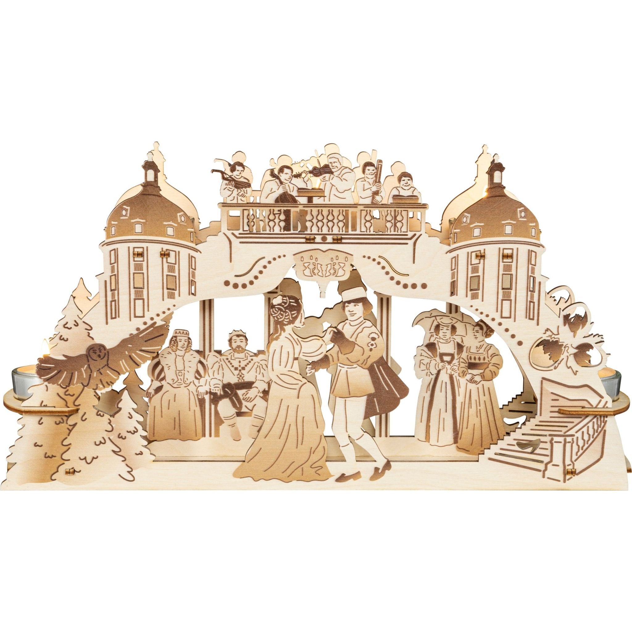 Der Teelichtleuchter aus Holz bietet Platz für fünf Teelichte und zeigt im Vordergrund Aschenbrödel und den Prinz beim Tanzen. Diese liebevoll gestalteten Details machen den Leuchter zu einem echten Blickfang.