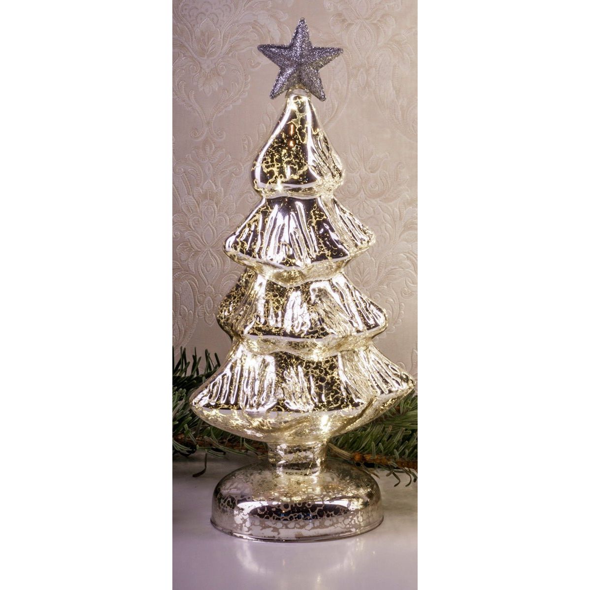 Die beleuchtete Weihnachtsdekoration aus Mercury Glas ist in silberner Farbe gehalten und glänzt wunderbar. Die Weihnachtsdekoration ist mit einer sparsamen LED Beleuchtung ausgestattet. Dank Batteriebetrieb können Sie die Weihnachtsdeko flexibel aufstellen. Erhältlich als Spitze oder Weihnachtsbaum.