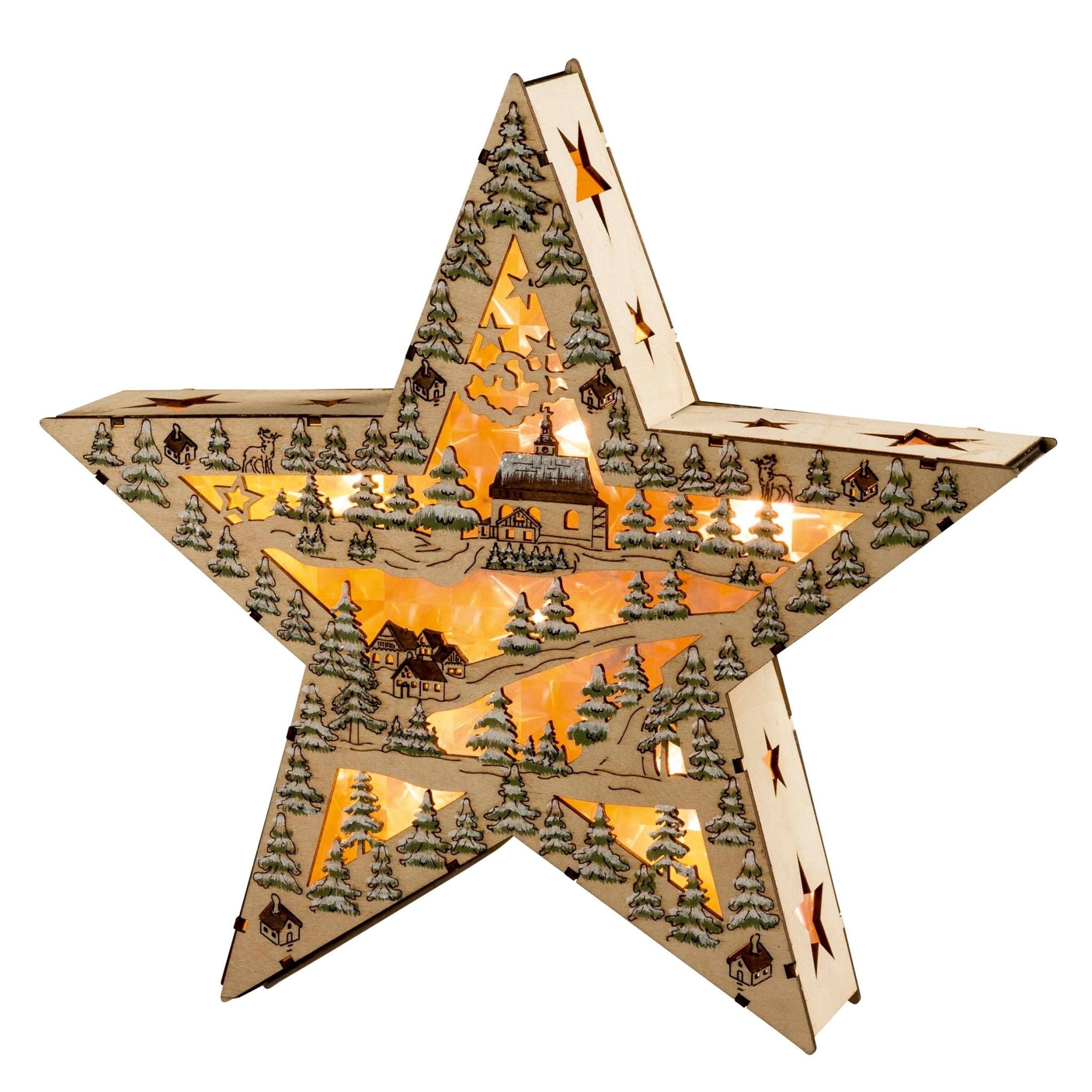 Dieser Dekostern ist entgegen seiner Adventsstern "Artgenossen" nicht unbedingt zum Aufhängen gedacht, sondern dient als Weihnachtsdekoration zum Hinstellen. Mit einem winterlichen Landschaftsmotiv in der Mitte und den vielen kleinen Tannenbäumen auf dem Rahmen schafft er sofort die richtige Stimmung. Seitlich außen sind zusätzlich Sternenformen eingefräst. Die sparsame LED Beleuchtung schafft zudem ein wunderbares Licht und lässt das Motiv 3-Dimensional wirken. Haben Sie schon die kleine Kirche entdeckt? Farblich ist der Adventsstern im Country Style gehalten. Der Stern wird durch Batterien betrieben und verfügt zudem über eine Timerfunktion.