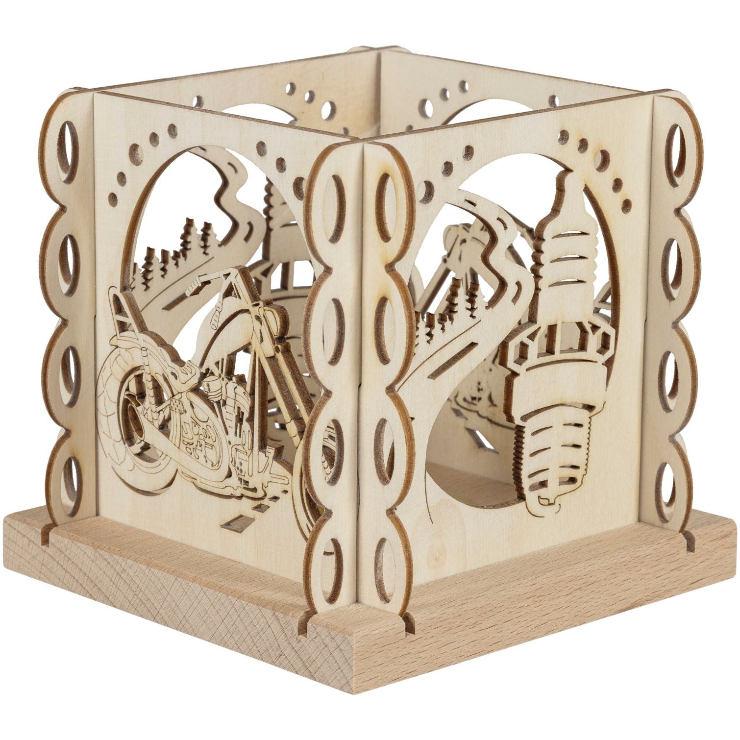 Der Kerzenhalter "Chopperfreund" ist ein außergewöhnliches Dekorationsstück für alle Motorrad-Enthusiasten. Gefertigt aus hochwertigem Holz, zeigt er auf vier kunstvoll gestalteten Seiten ein kraftvolles Chopper-Motorrad, eine stilisierte Straße und eine markante Zündkerze. Das warme Licht eines Teelichts setzt die dynamischen Motive perfekt in Szene und schafft eine gemütliche, zugleich kraftvolle Atmosphäre.