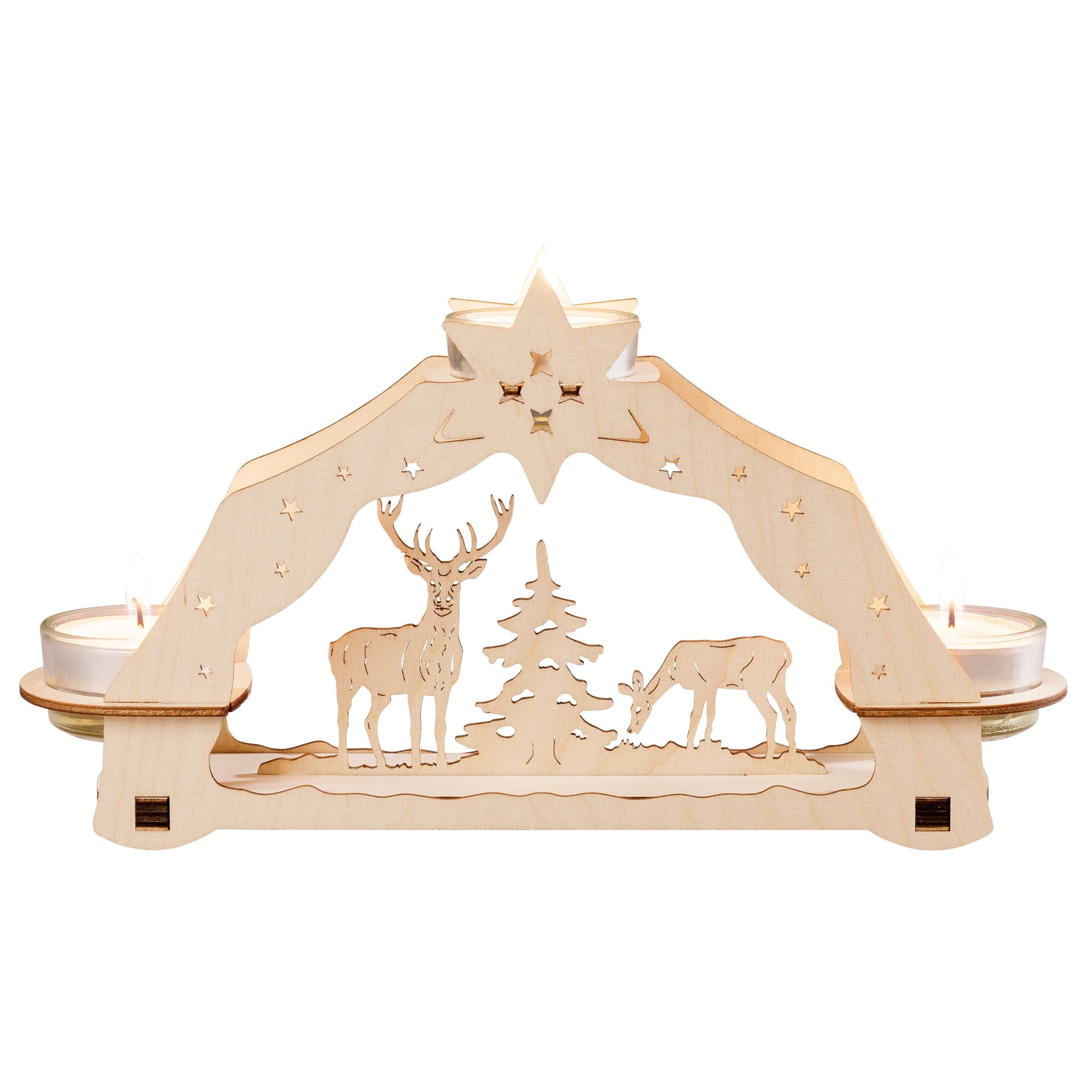 Der Kerzenhalter „Waldmotiv“ präsentiert eine filigrane Szene mit Hirsch, Reh und Tannenbaum, ausgeschnitten aus naturbelassenem Holz. Die warmen Lichtreflexe der drei Teelichte erzeugen eine gemütliche Atmosphäre und bringen die winterliche Waldlandschaft dekorativ zur Geltung.