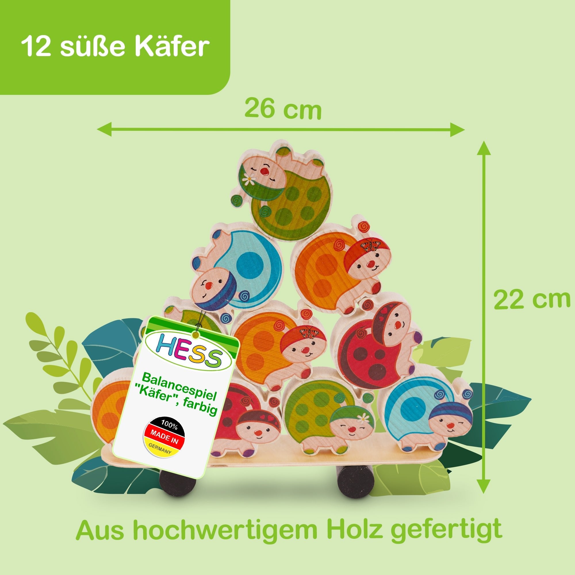 Das Balancespiel "Käfer" ist ein faszinierendes Spiel für Jung und Alt. Die 12 niedlichen, farbenfrohen Käferchen wurden sorgfältig aus Holz gefertigt und bieten eine spannende Herausforderung für die ganze Familie. Hergestellt in Deutschland, erfüllt dieses Geschicklichkeitsspiel höchste Qualitätsstandards und garantiert langlebigen Spielspaß.