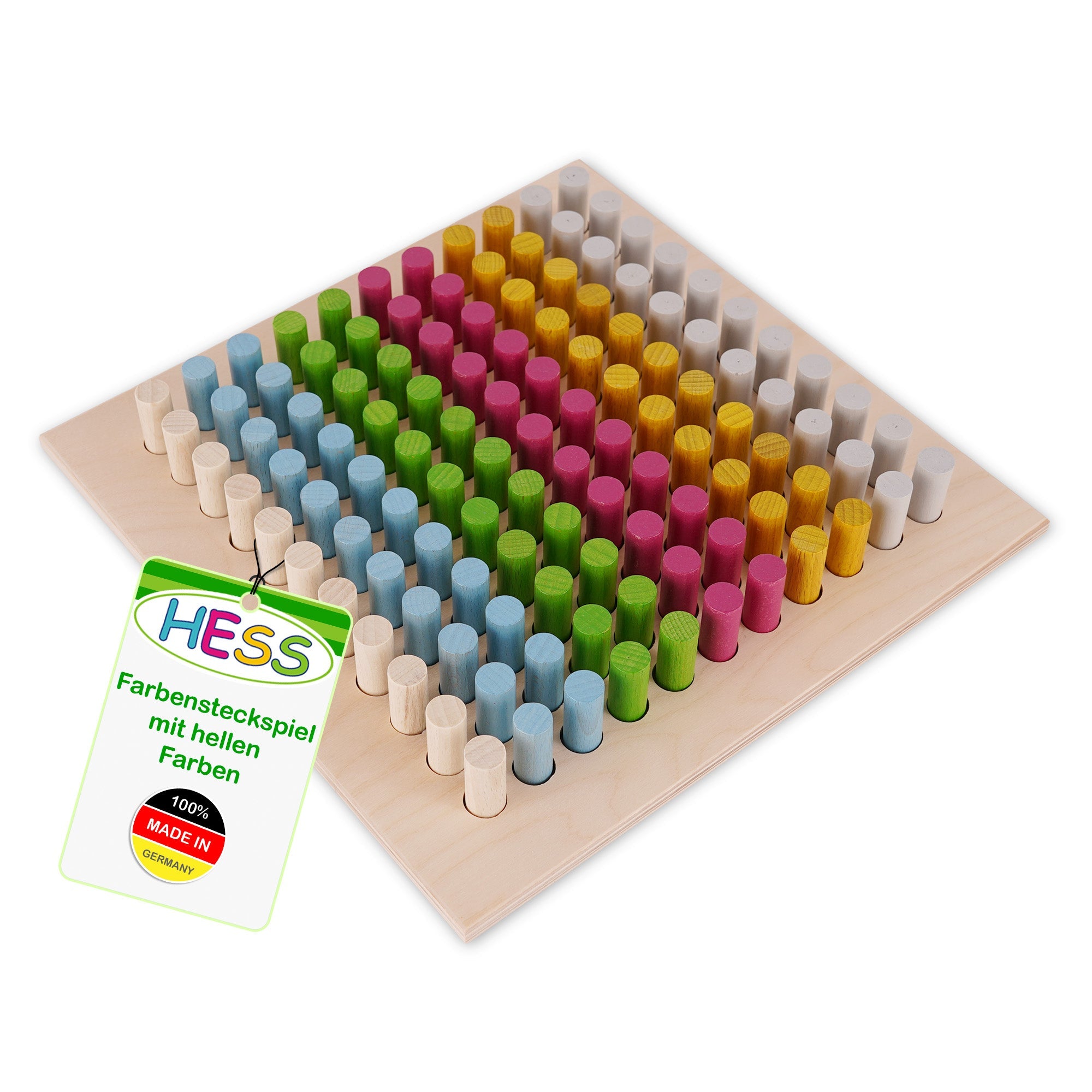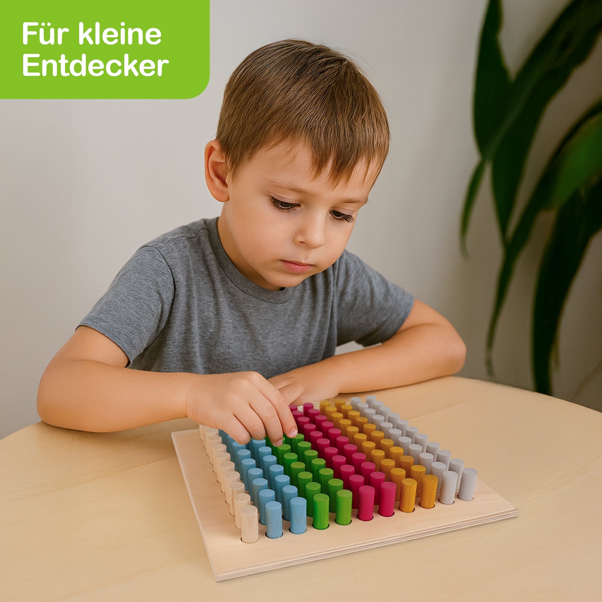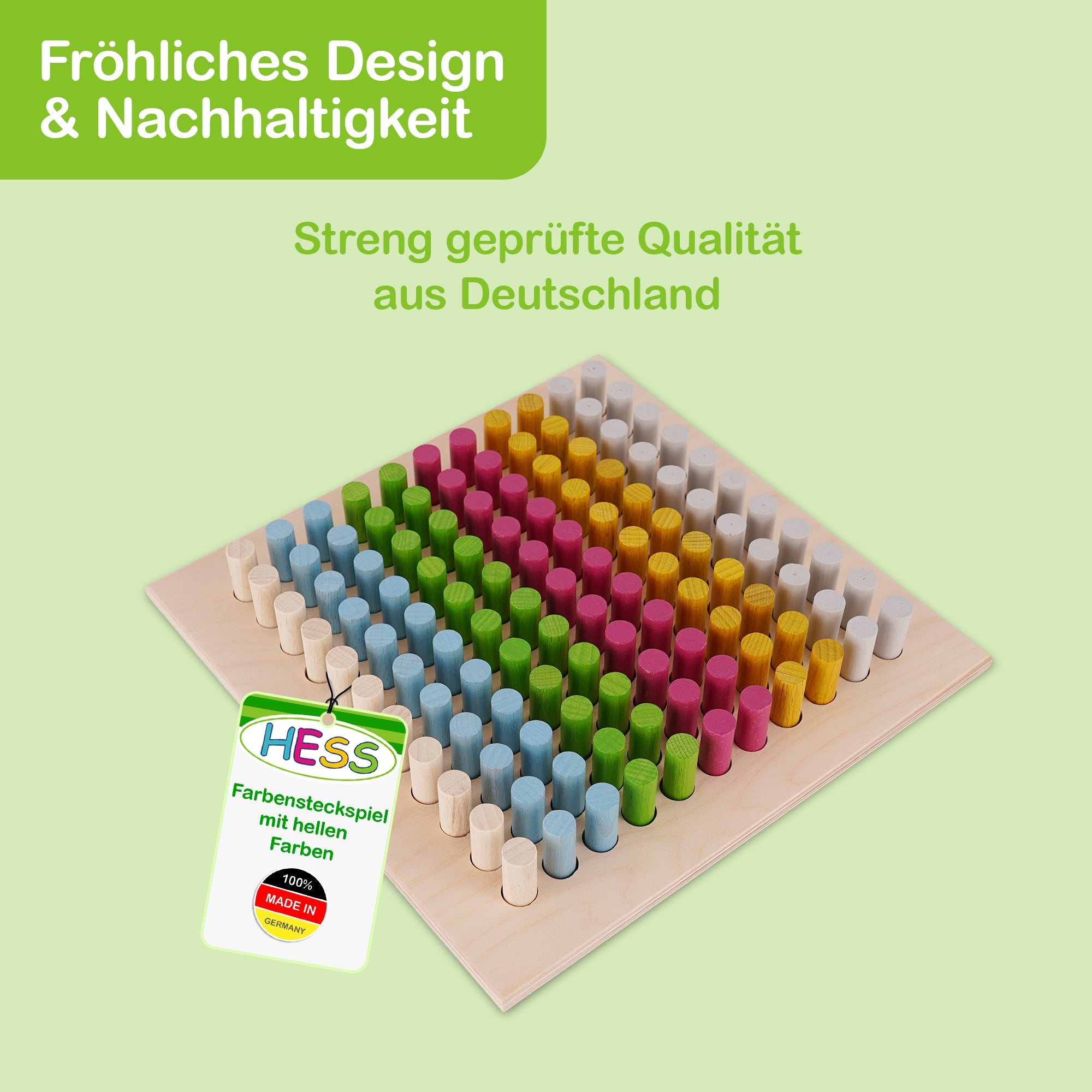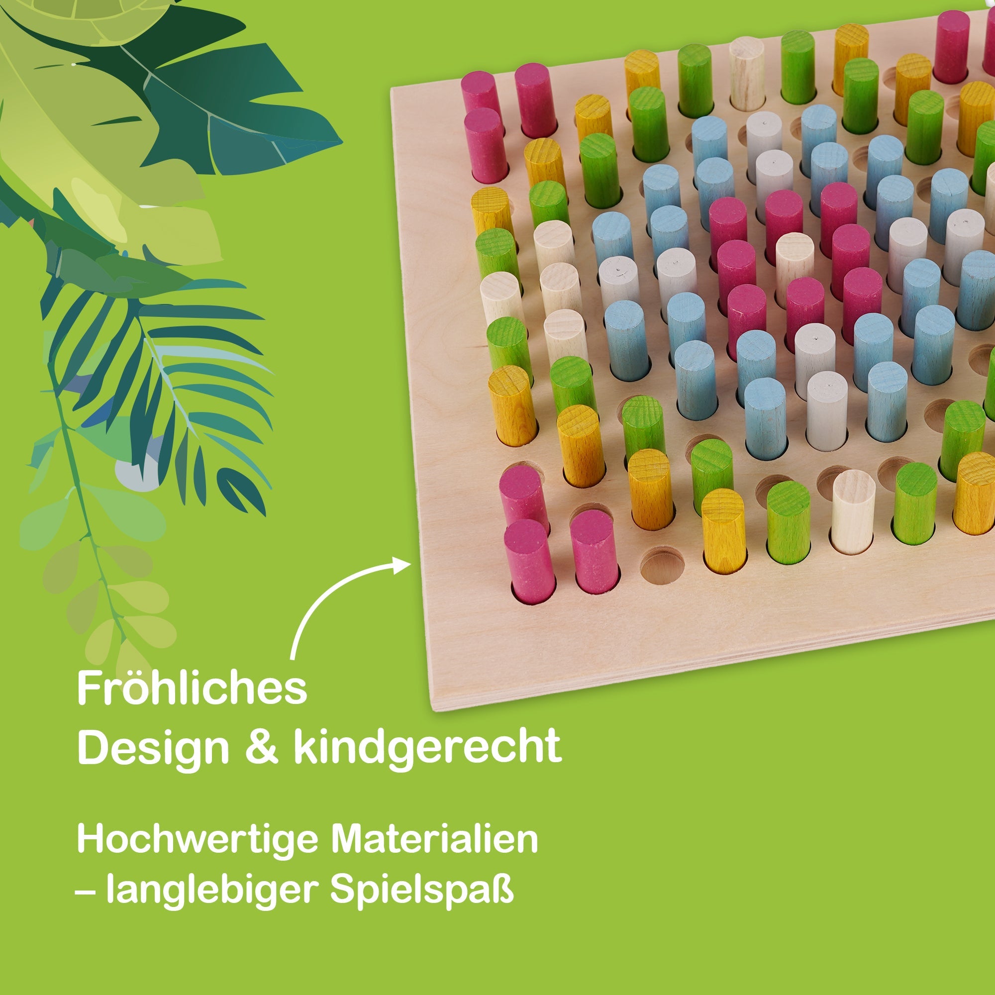 Das Farbensteckspiel in hellen Farben ist ein absolutes Must-Have für Kinder ab 3 Jahren. Hergestellt aus hochwertigem Holz und mit insgesamt 121 Pins in sechs verschiedenen Farbtönen, sorgt dieses Spielzeug nicht nur für stundenlangen Spielspaß, sondern fördert auch die kognitive Entwicklung der Kleinen. Die bunten Pins laden zum Erkunden ein – kleine Finger können sie spielerisch greifen und wieder herausziehen.