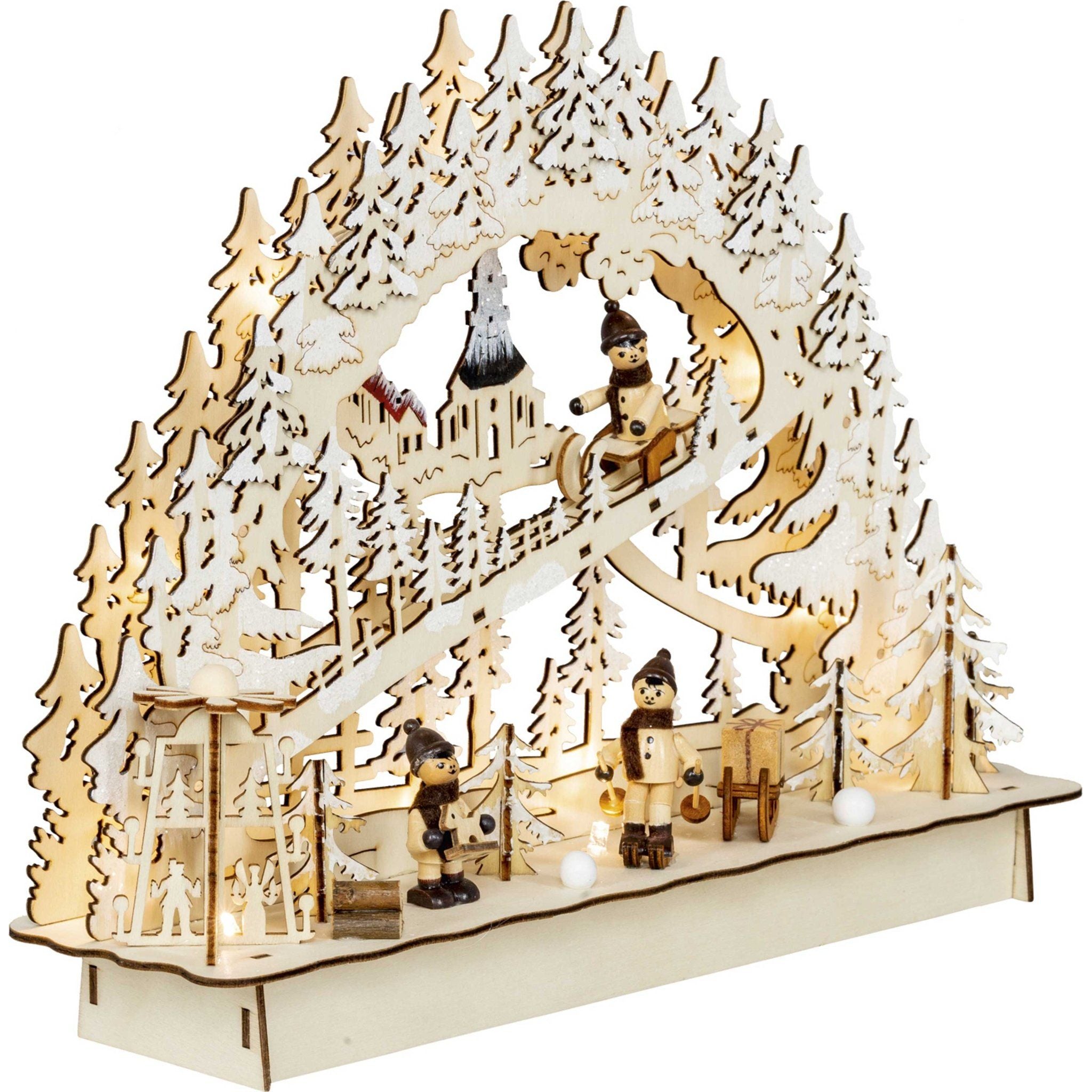 Dieser LED-Lichterbogen in Form eines Seiffener Winterwalds ist 33 x 25,5 x 9 cm groß und für den Batteriebetrieb mit Timer geeignet. Er ist dank der LEDs, die eine angenehme Atmosphäre schaffen, ein richtiges Schmuckstück. Durch den Timer wird das Licht automatisch nach 6 Stunden ausgeschaltet. So können Sie sich entspannen und die Weihnachtsstimmung genießen.