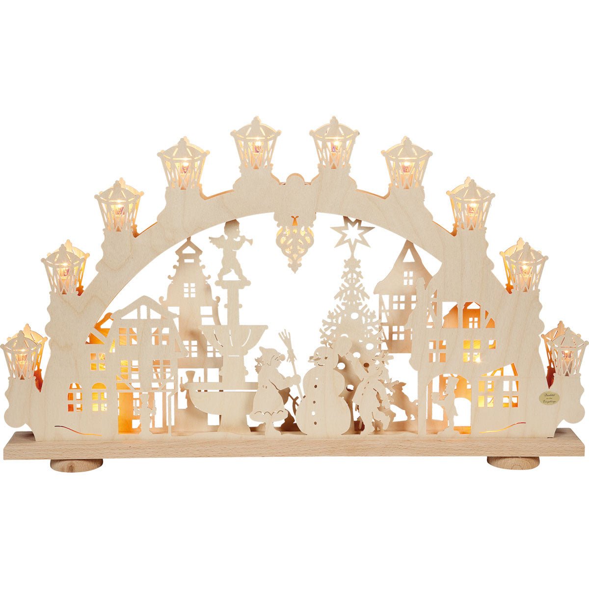 Großer, üppiger Schwibbogen, der keine Wünsche offen lässt. Hier kann man sich in den Details verlieren. Um dem geschäftigen Treiben der vorweihnachtlichen Stadt gerecht zu werden, wurden hier gleich mehrere Ebenen hintereinander platziert. Prächtige Stadthäuser geben den Rahmen für eine Marktplatzszene mit fürstlichem Engelsbrunnen, Weihnachtsbaum und spielenden Kindern. 15 LEDs, 10 davon auf dem Bogen, sorgen für die richtige Beleuchtung. Das Licht ist im Inneren des 3D-Schwibbogens verlegt und strahlt indirekt. Der Schwibbogen ist für den Netzbetrieb bestimmt und sollte in der Nähe einer Steckdose aufgestellt werden. Im Dunkeln entfaltet der Schwibbogen seine ganze Wirkung mit verschiedenen hellen und dunklen Bereichen. Dadurch wirkt die Szene lebensecht. Der Schwibbogen ist "Made in Germany"!