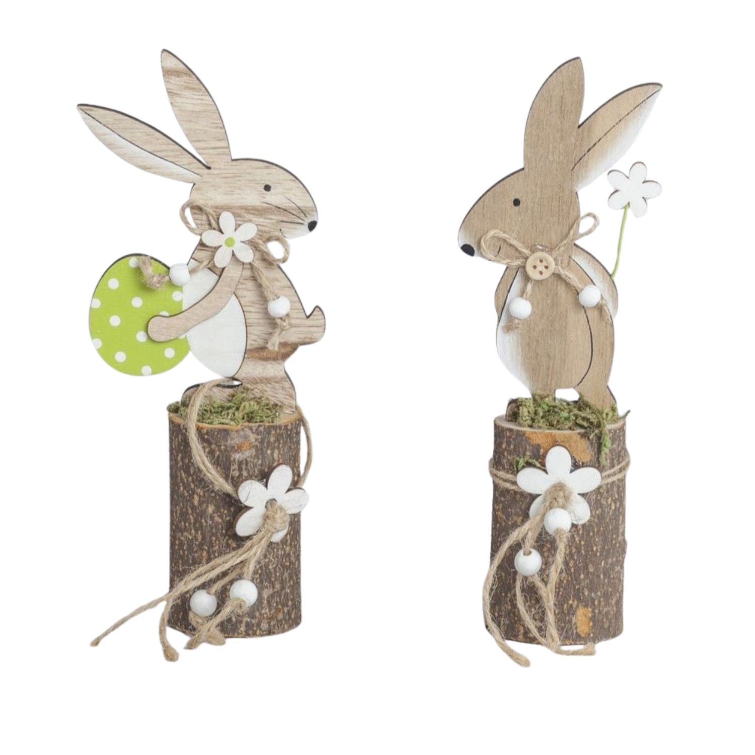 Das Osterhasenpaar aus Holz (20 cm) bringt natürlichen Charme und eine warme, freundliche Stimmung in Ihre Osterdekoration. Die beiden Hasen stehen auf einem rustikalen Baumstamm und wirken besonders harmonisch in ihrer naturfarbenen Gestaltung. Perfekt, um die Frühlingszeit stilvoll einzuläuten.