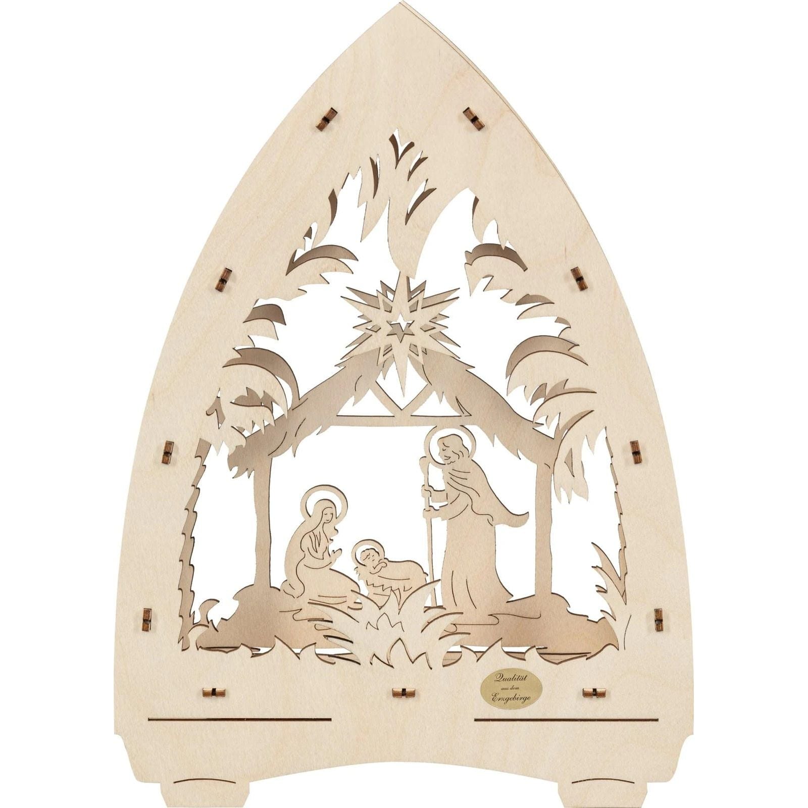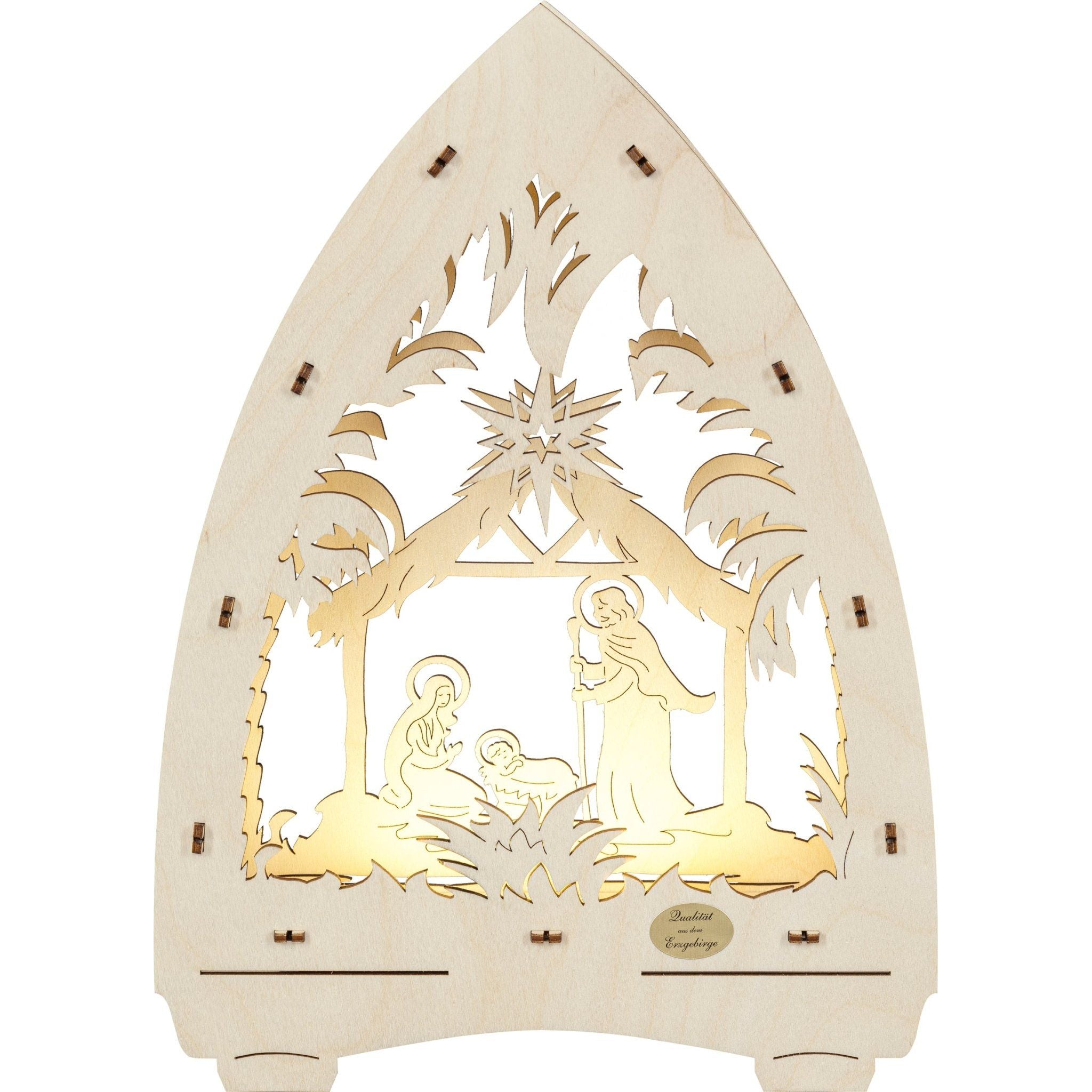 Die LED Lichterspitze zeigt eine liebevoll gestaltete Darstellung der Geburt Christi. In der Mitte liegt das Jesuskind in der Krippe, flankiert von Maria und Josef. Ein leuchtender Stern sowie Palmen rahmen die Szene ein und verleihen ihr eine besondere Tiefe.