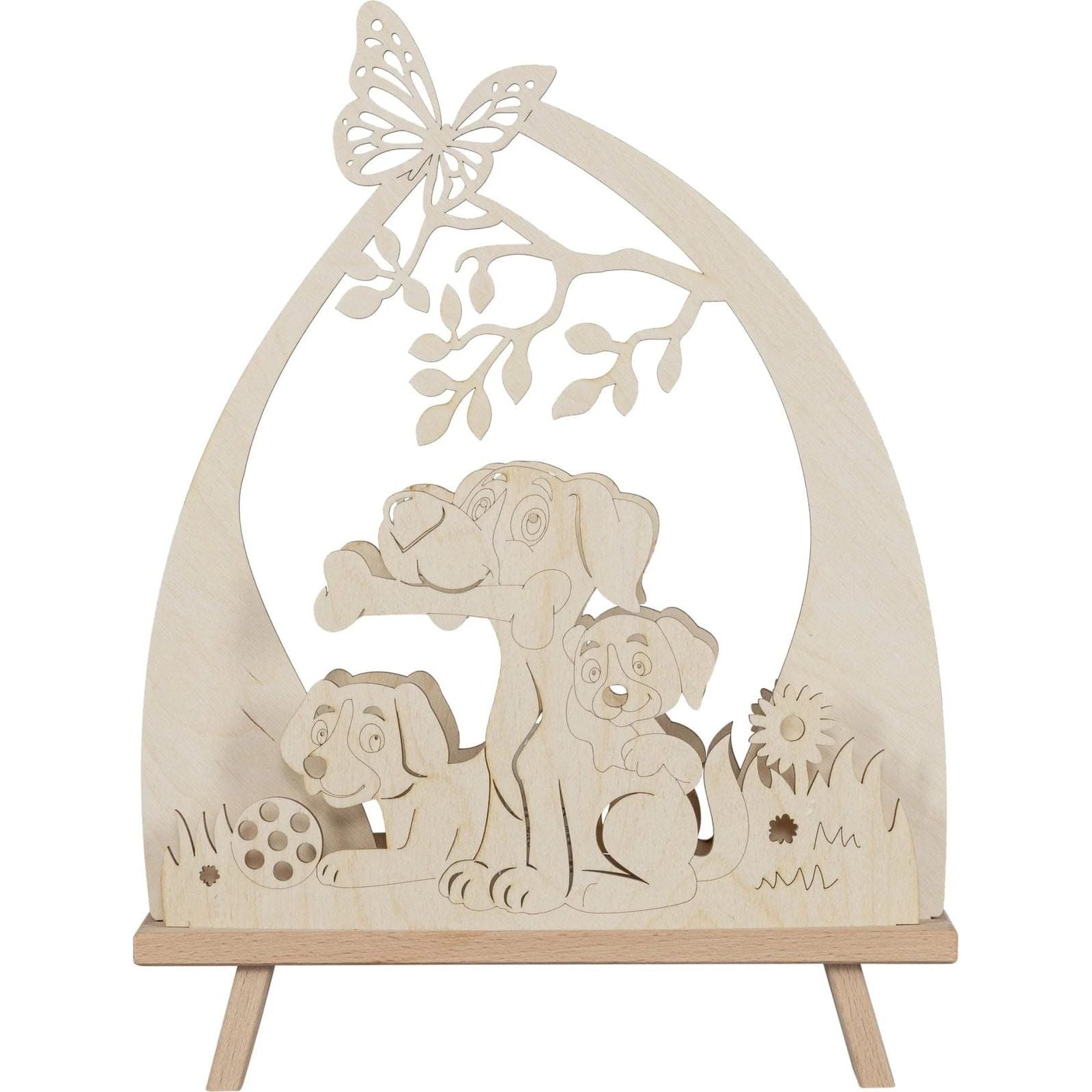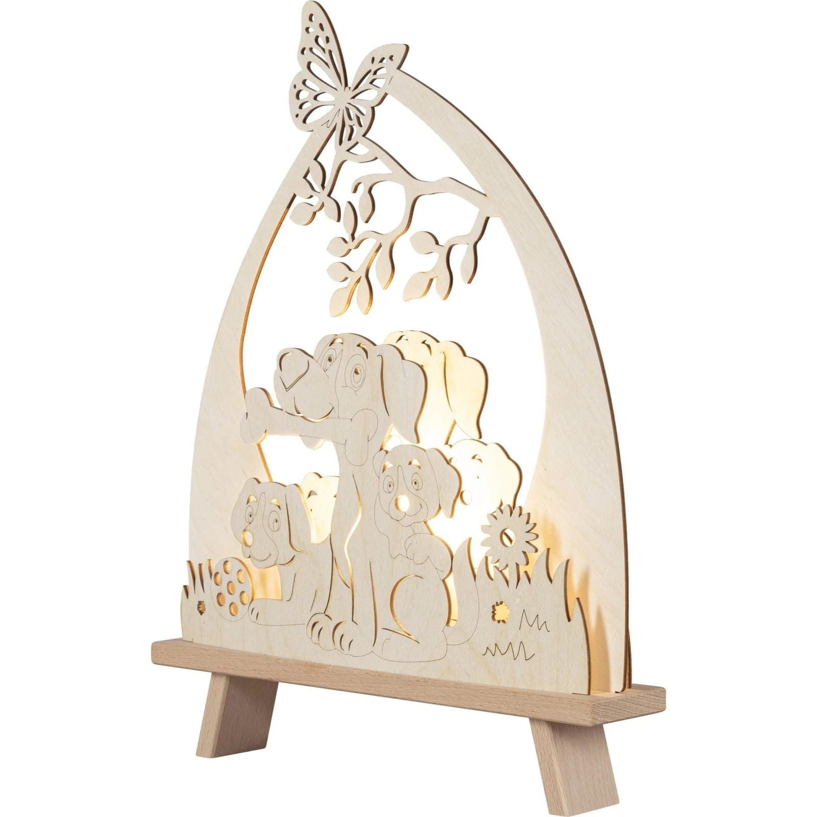 Die LED-Standleuchte "Hundefreund" ist ein liebevoll gestaltetes Wohnaccessoire für alle, die eine besondere Verbindung zu Hunden haben. Mit einer Höhe von 41 cm und gefertigt aus hochwertigem Holz, zeigt sie drei fröhliche Fellnasen, die entspannt im Gras sitzen. Einer der Hunde hält stolz einen Knochen im Maul, während ein zarter Schmetterling auf einem Ast Platz genommen hat. Die integrierte LED-Beleuchtung bringt diese Szene stimmungsvoll zur Geltung und sorgt für eine warme, gemütliche Atmosphäre – perfekt für die Weihnachtszeit.