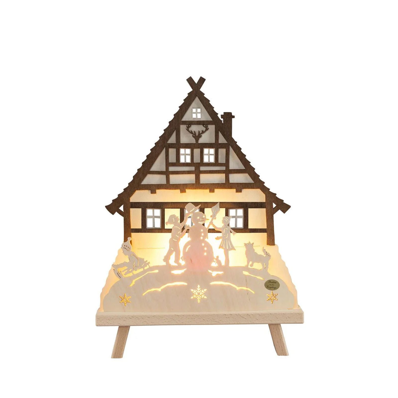 Die LED Standleuchte „Waldhaus“ ist eine echte Rarität unter den Weihnachtsdekorationen. Mit ihrem besonderen Lichtkonzept erinnert sie an ein kleines Schattentheater, das die Szene eines Fachwerkhauses mit spielenden Kindern und einem Schneemann in der Dämmerung lebendig werden lässt. Die Kombination aus hellem und dunklem Sperrholz verleiht dem Motiv Tiefe und Wärme.