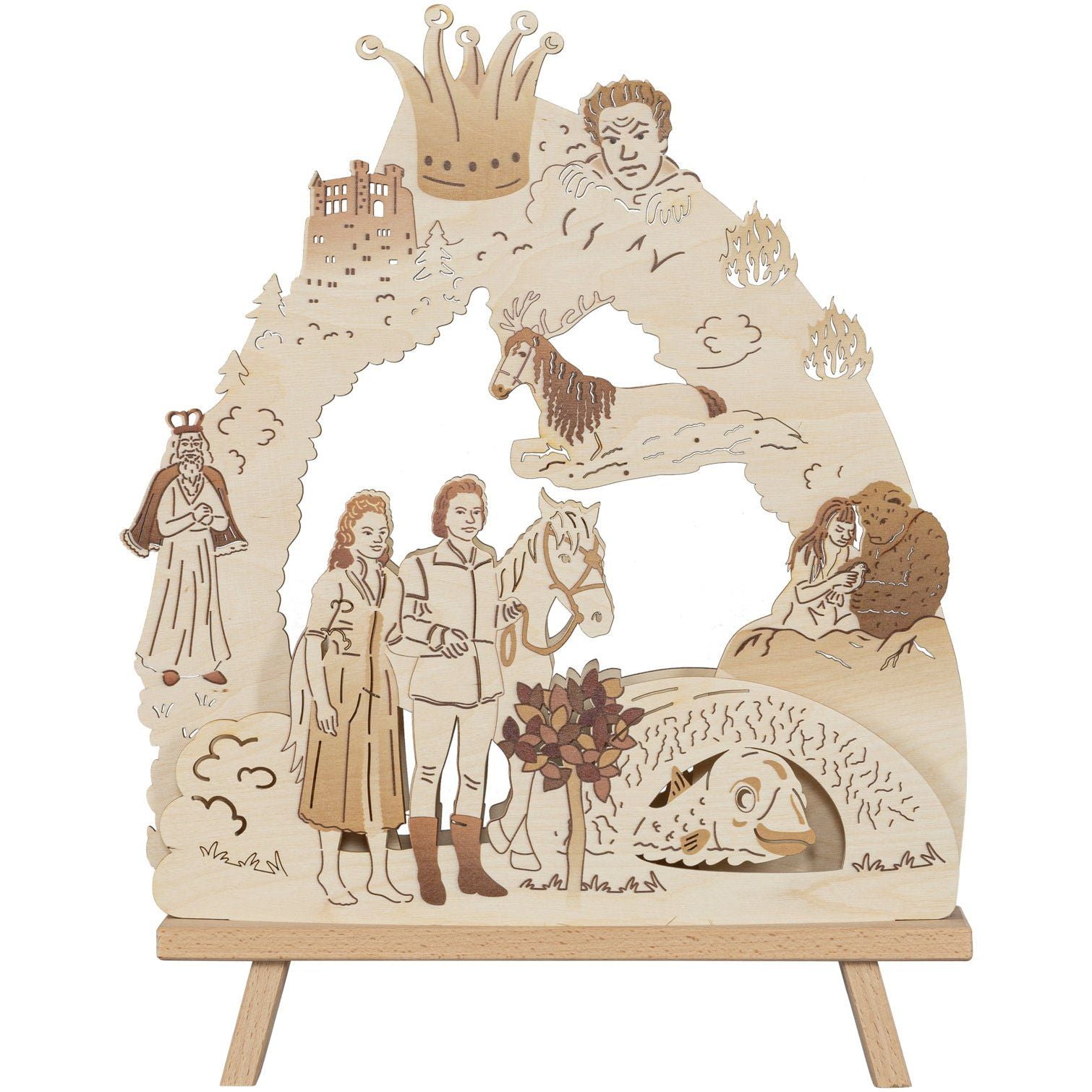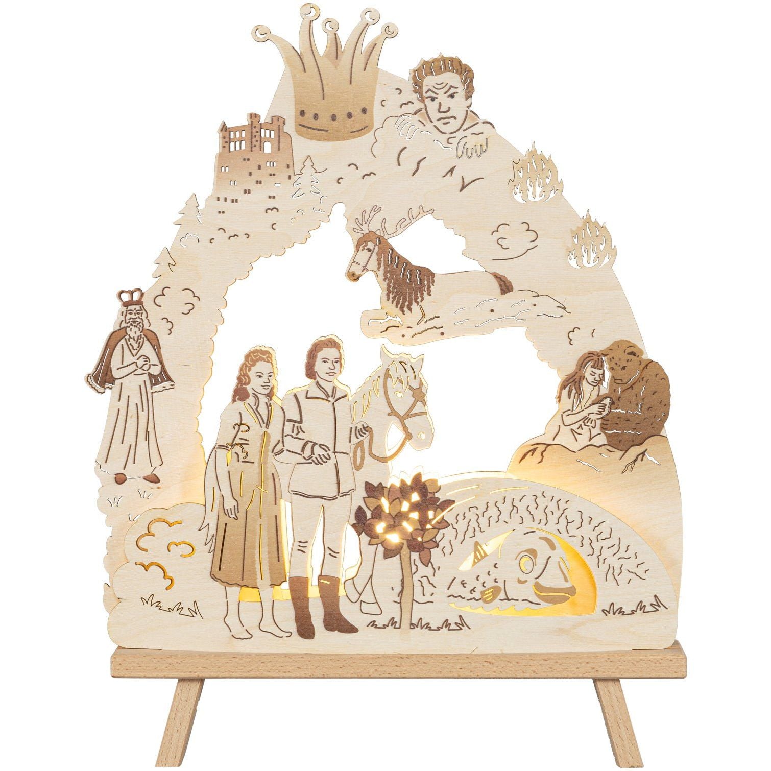 Die LED Standleuchte "Das singende, klingende Bäumchen®" zeigt eine liebevoll gestaltete Szene aus dem bekannten DEFA-Märchen. In der Mitte sind die Prinzessin, der Prinz mit seinem Pferd, das singende, klingende Bäumchen und der gerettete Fisch dargestellt. Die farbig abgesetzten Details machen diese Lichterspitze aus Holz mit LED-Beleuchtung zu einem echten Blickfang.