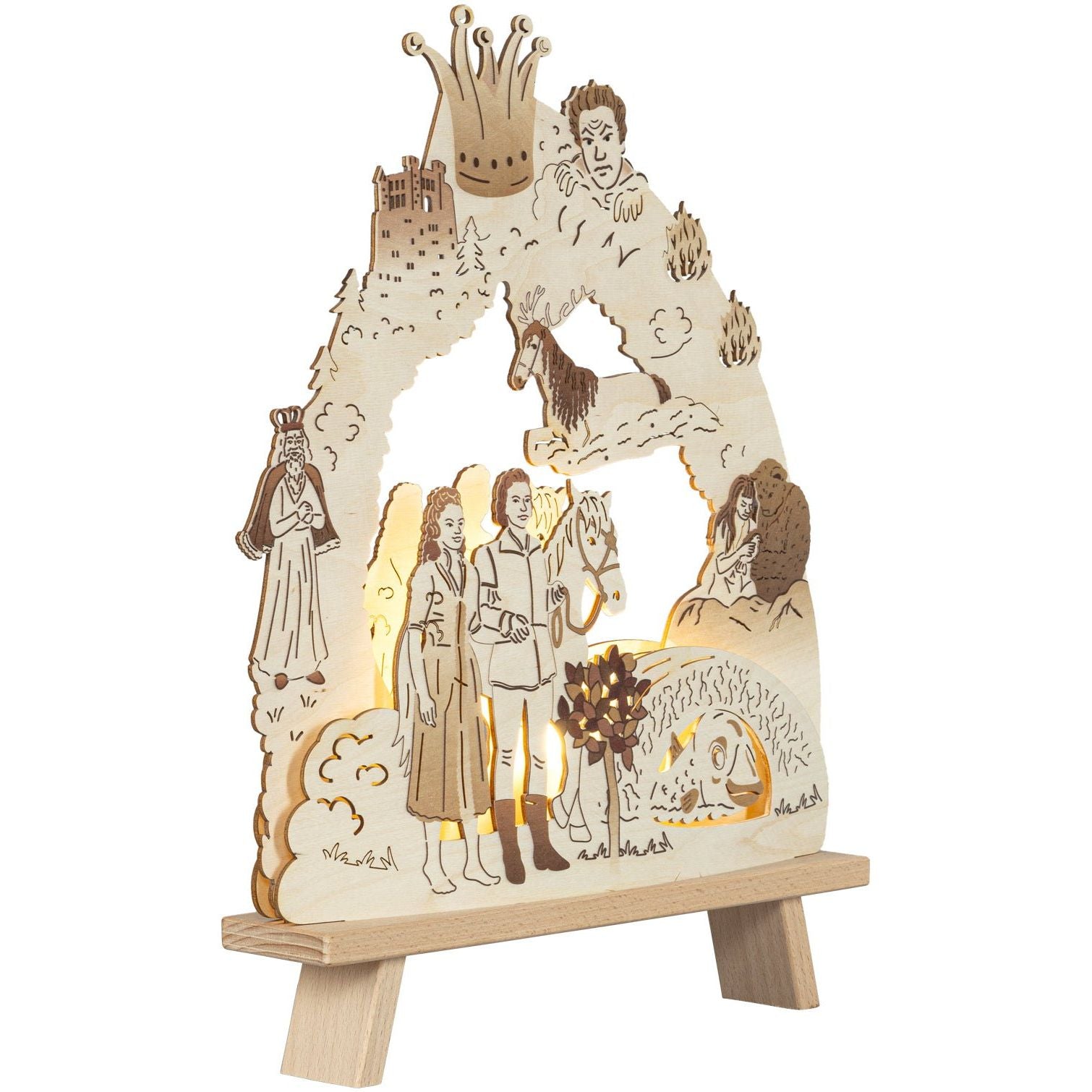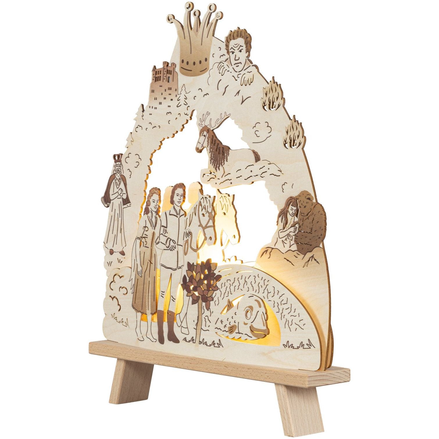 Auf der einen Seite der LED Standleuchte sieht man die verzauberte Prinzessin mit dem Bär, auf der anderen den König. Die Spitze zieren die Krone der Prinzessin, ein Schloss, der böse Zwerg und das Pferd, das die Prinzessin aus dem Schnee rettete. Diese kunstvoll gearbeitete Lichterspitze aus Holz stammt aus dem Erzgebirge und überzeugt durch ihre detailreiche Gestaltung und hochwertige Verarbeitung.