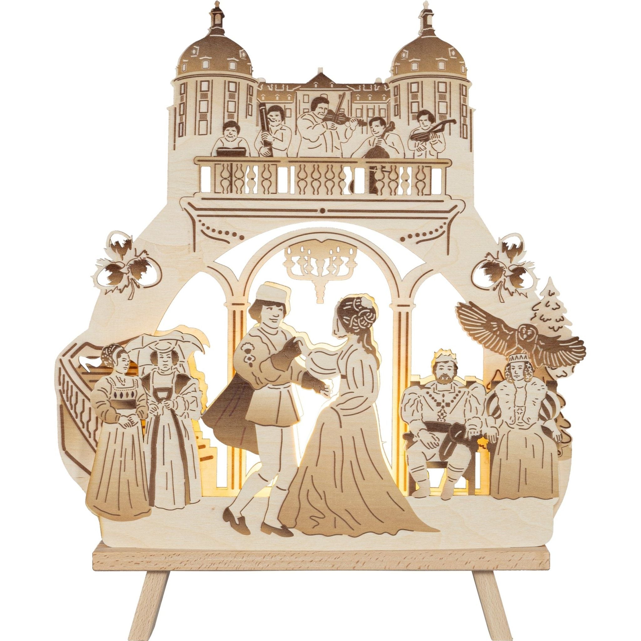 Im Hintergrund sind der König und die Königin sowie die Stiefmutter mit der Stiefschwester zu sehen. Über ihnen thront majestätisch die Kapelle vor dem Schloss Moritzburg. Ein zauberhaftes Bild voller Eleganz und Märchenhaftigkeit entfaltet sich vor den Augen der Betrachter.