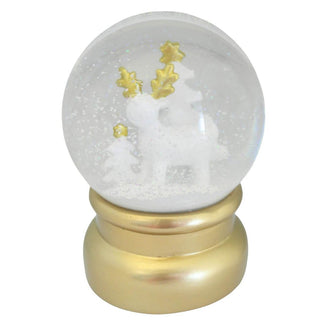 Schneekugel mit weißem Elch mit goldenen Geweihen, zwei weißen Bäumen mit goldenen Sternen und goldfarbener Basis, 12 cm hoch – glitzernde Weihnachtsdekoration.