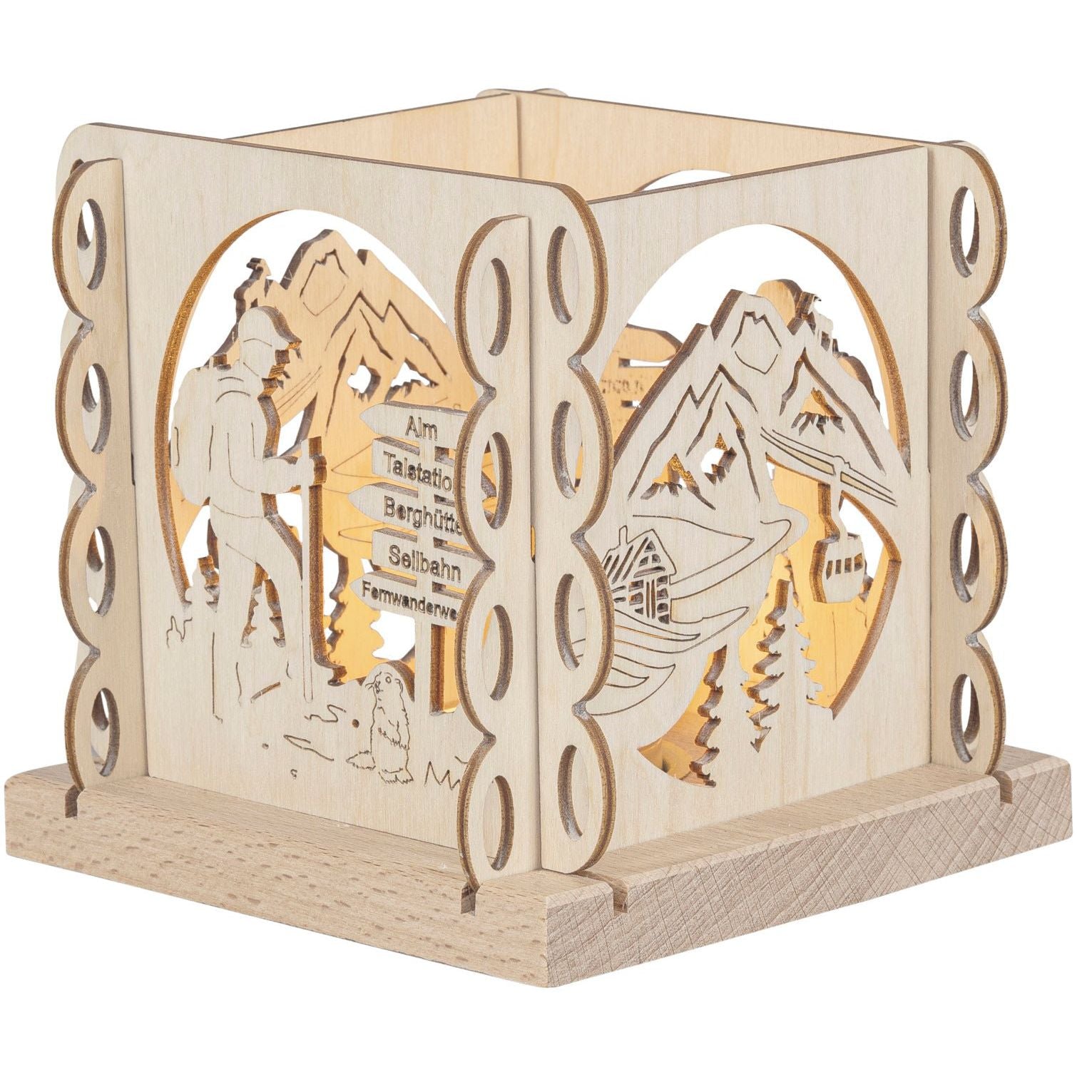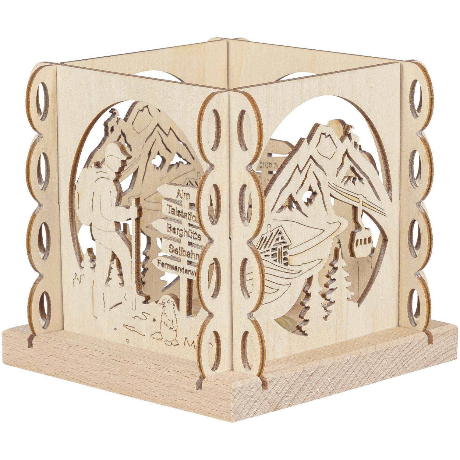 Der Kerzenhalter / Laterne "Wanderfreund" ist ein liebevoll gestaltetes Deko-Element für alle, die die Natur und das Wandern lieben. Mit einer Höhe von 12 cm und gefertigt aus hochwertigem Holz, zeigt er eine idyllische Berglandschaft, einen Wanderer mit Wegweisern und eine stilisierte Seilbahn. Ein Platz für ein Teelicht sorgt für warmes, gemütliches Licht, das das Motiv stimmungsvoll in Szene setzt – ideal für das Wohnzimmer, den Flur oder als originelles Geschenk für Wanderfreunde.