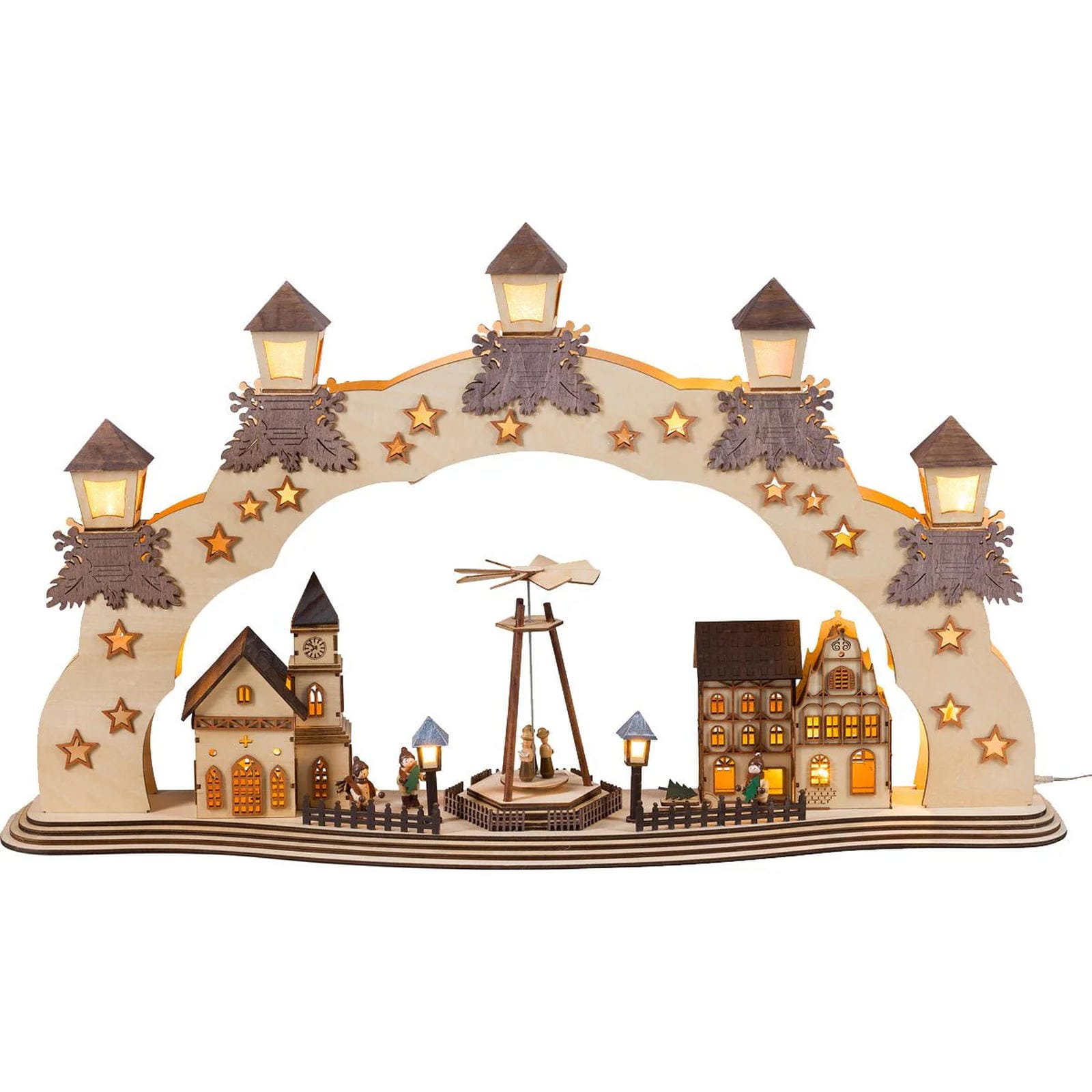 Der Bogen ist mit fünf Laternen, eingefrästen Sternen, einer kunstvoll gearbeiteten Kirche, Stadthäusern und zwei Straßenlaternen beleuchtet. Ein besonderes Highlight ist die elektrisch betriebene bewegliche Pyramide, auf der sich drei Sänger drehen. Drei gedrechselte Figuren beleben das bunte Treiben und verleihen dem Lichterbogen eine lebendige Note.