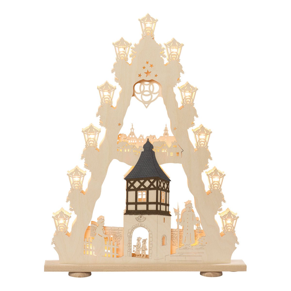 Bei unserer Lichterspitze "Burgromantik" ist der Name Programm. Die insgesamt 15 flammige LED Lichterspitze – 4 Lampen leuchten das Innere aus – ist liebevoll mit einem ganz romantisch-klassischen Weihnachtsmotiv gestaltet. Diese Lichterspitze veredelt ihren Standort, egal ob sie das schöne Stück auf der Fensterbank oder einer Kommode platzieren. Kabel und Lampen sind dekorativ versteckt, sodass nichts die filigrane Optik mit Fachwerkmotiv und alter Burgmauer, Nachtwächter, Händlerin und Kindern stört. Spannend ist die Perspektive auf das kleine Dorf im Hintergrund. Das Torhaus ist zweifarbig gestaltet und sorgt für einen wundervollen Kontrast. Es handelt sich hierbei um ein Originalprodukt aus dem Erzgebirge. Die Lichterspitze steht auf einem soliden Sockel und ist hochwertig und langlebig verarbeitet. Zudem wird sie sicher und haltbar verpackt.