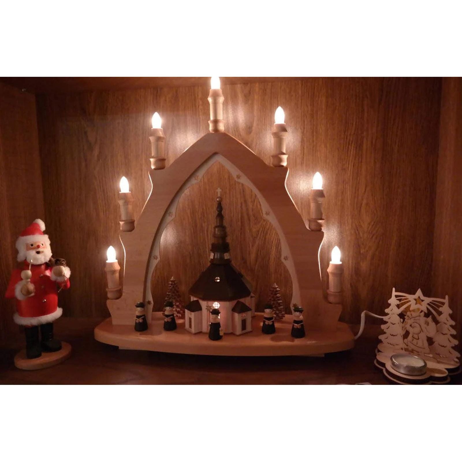 Es muss nicht immer ein großer Schwibbogen sein. Besonders Sammler der Holzkunst aus dem Erzgebirge schätzen den Varianten- und Ideenreichtum der Spielzeugmacher. In der Mitte dieser Lichterspitze steht die weltberühmte Seiffener Kirche. Ein ganz besonderes Detail sind die gedrechselten Kurrende-Figuren und die filigran gestalteten Bäumchen. Neben den 7 LED-Kerzen ist auch das Innere der Kirche durch die 8. Kerze dezent beleuchtet. Diese hochwertige Winter- und Weihnachtsdekoration passt in jedes Fenster und sorgt mit Sicherheit für Bewunderung. Bei der Lichterspitze handelt es sich um originale Handwerkskunst aus dem Erzgebirge mit höchsten Ansprüchen an die Qualität.