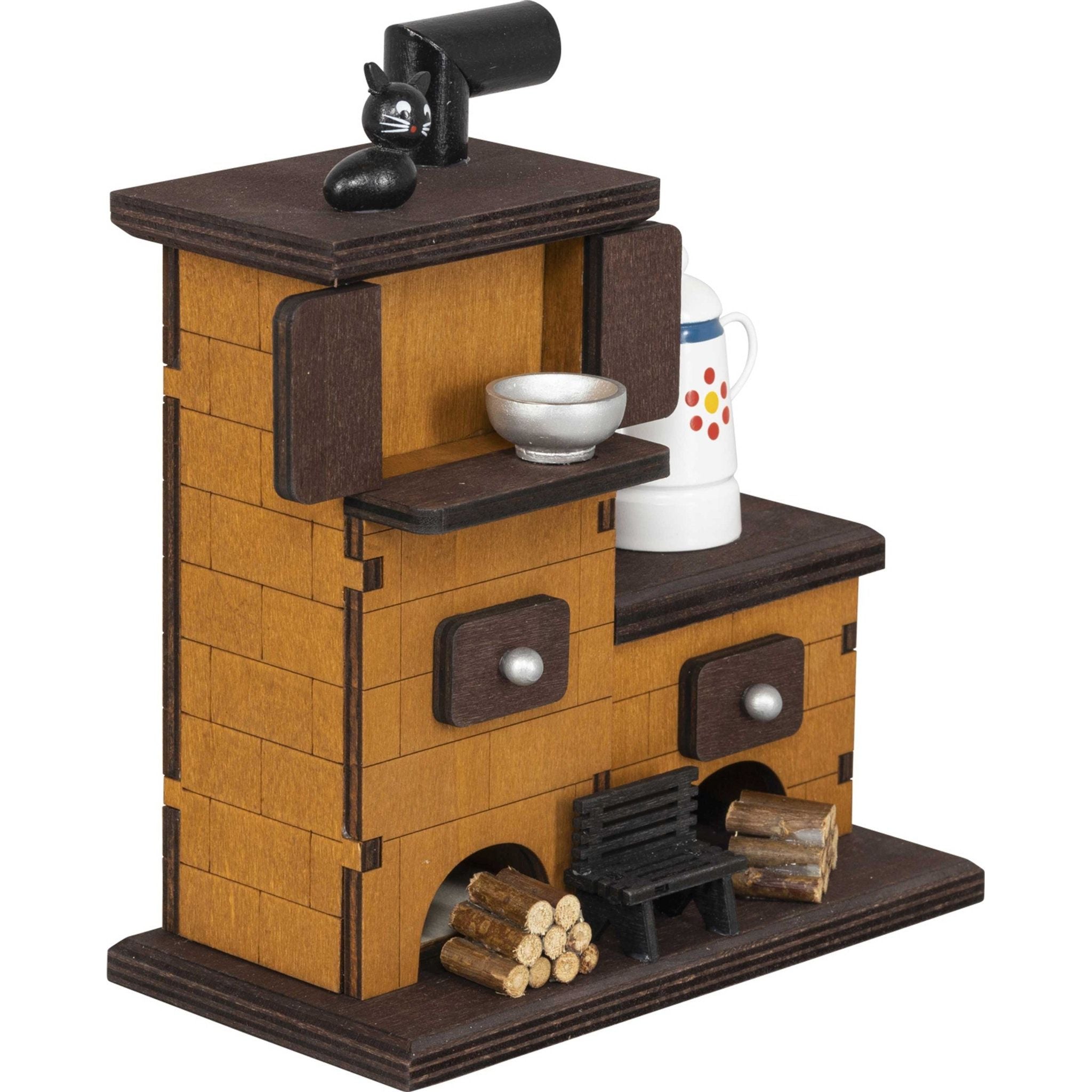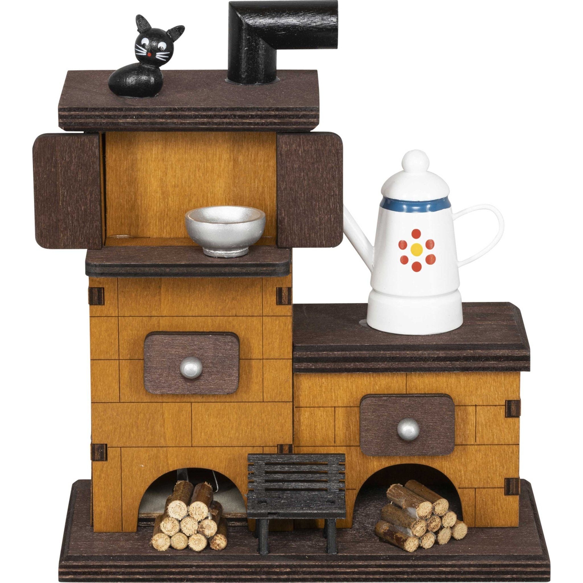 Ein besonderes Highlight dieses Räucherofens ist die liebevolle Gestaltung: Eine Katze liegt gemütlich auf dem warmen Ofen, während der Kaffee in der Kaffeekanne auf dem Ofen warm gehalten wird. Diese detailreiche Szenerie verleiht dem Kachelofen einen besonderen Charme und sorgt für eine gemütliche Atmosphäre.