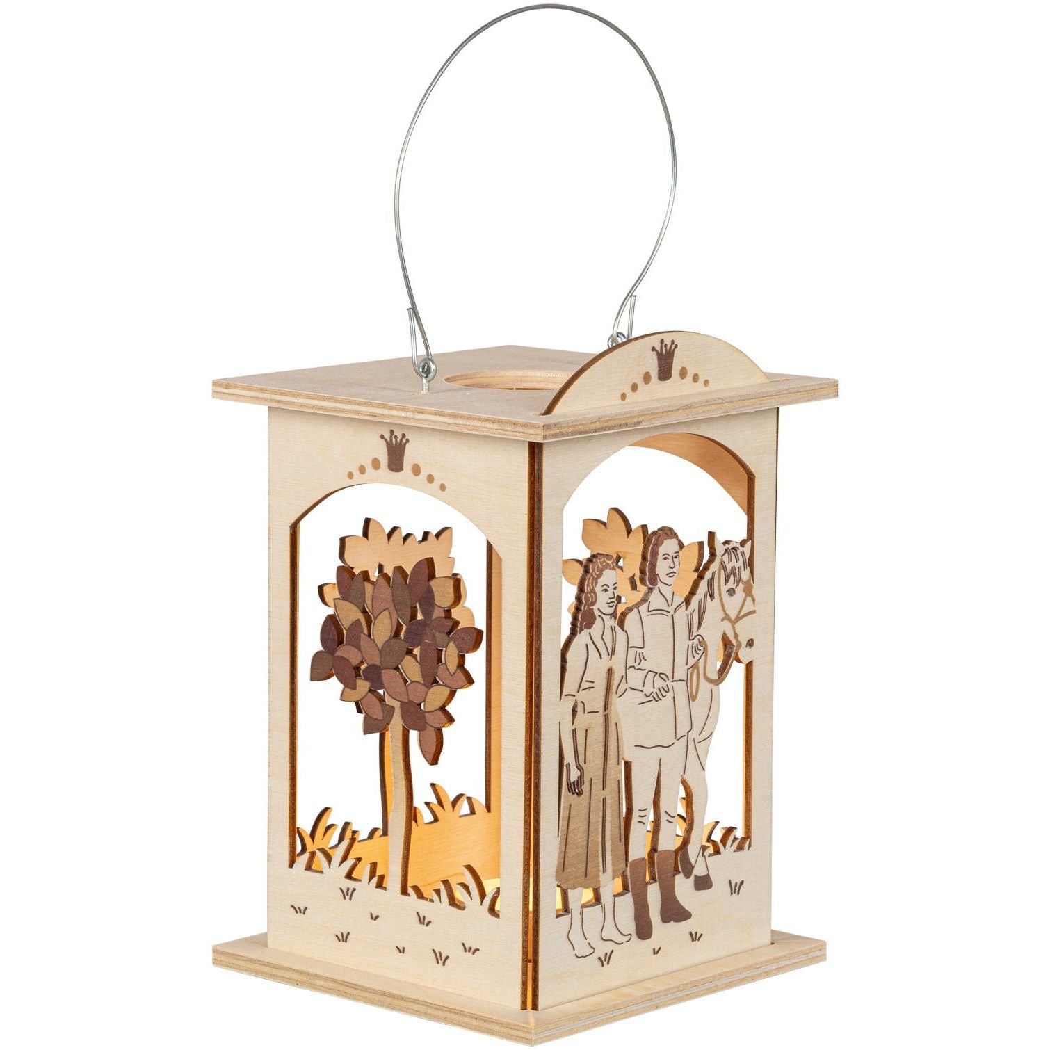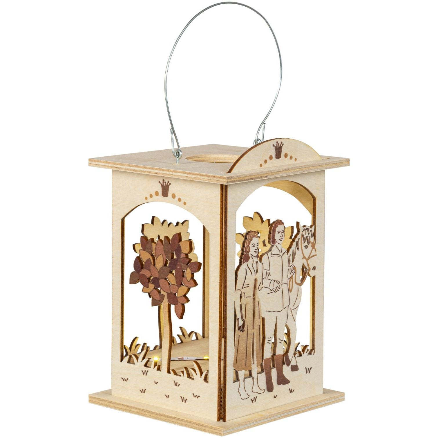 Die Laterne aus Holz mit LED-Beleuchtung zeigt auf drei Seiten das singende, klingende Bäumchen, während die vierte Seite die Prinzessin, den Prinzen und sein Pferd darstellt. Die liebevoll gestalteten Motive machen die Laterne aus Holz zu einem echten Blickfang und bringen märchenhaften Zauber in jeden Raum.