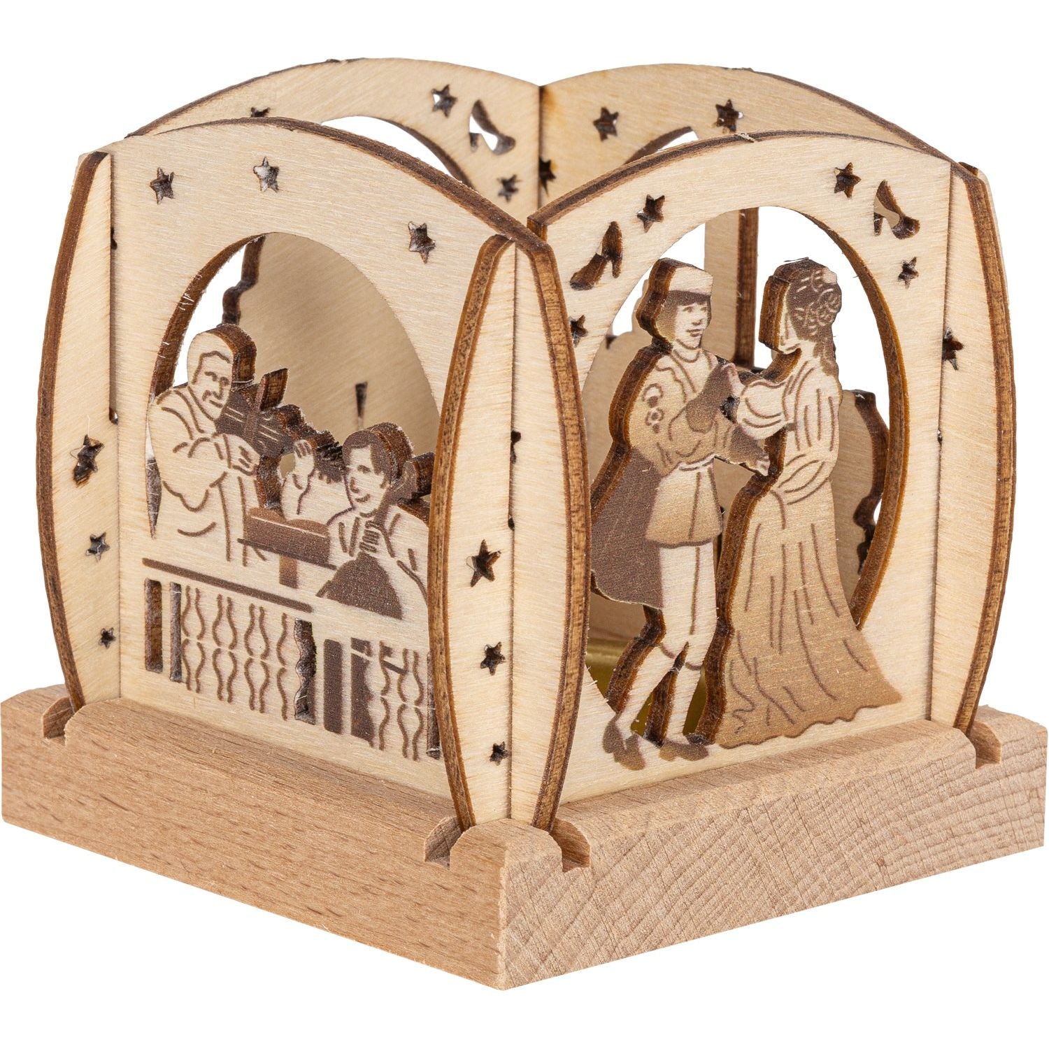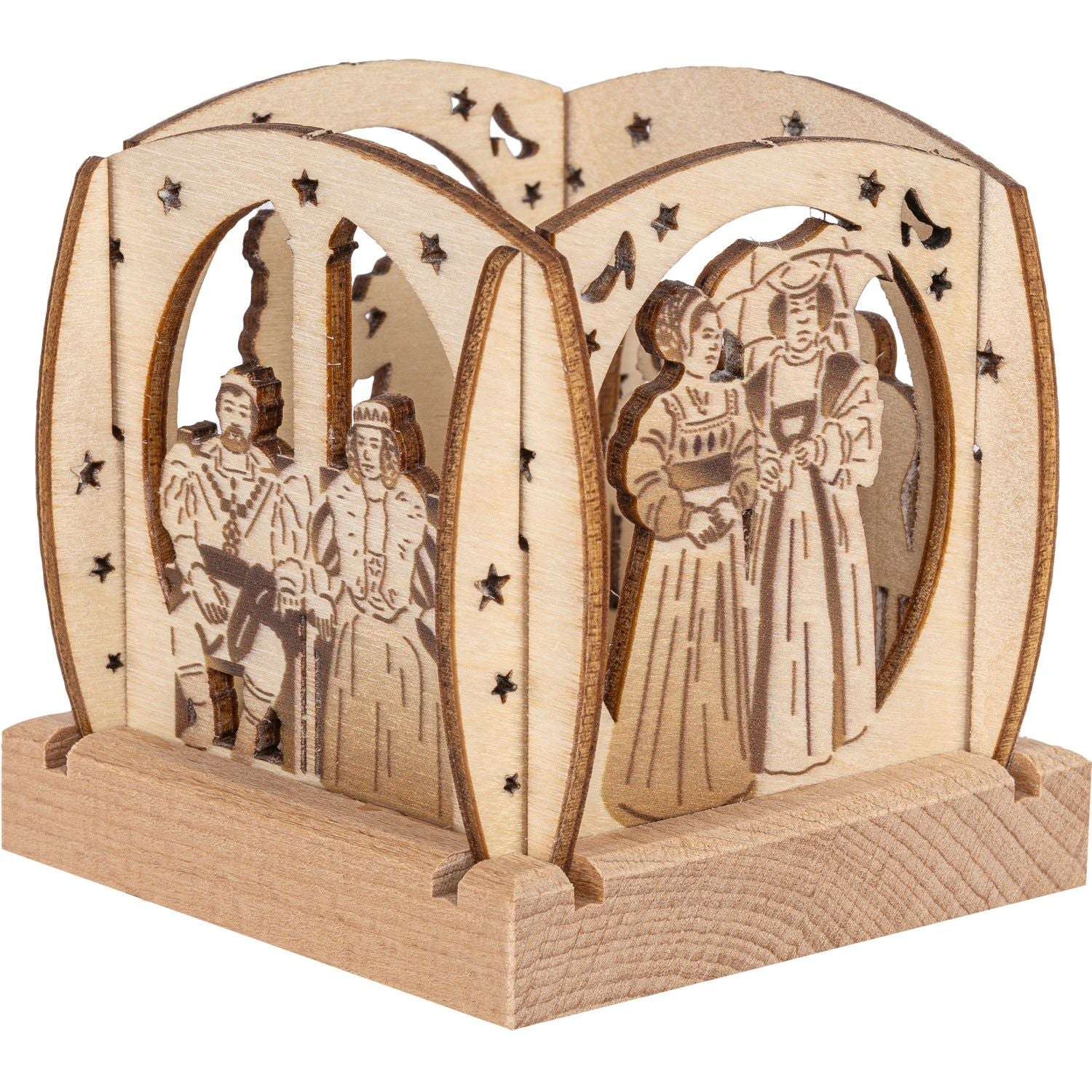 Dieser wunderschöne Mini-Teelichthalter aus Holz ist ein echter Blickfang für jede märchenhaft festliche Tischdekoration. Jede der vier Seiten zeigt ein bezauberndes Motiv: Aschenbrödel und Prinz, König und Königin, Stiefmutter und Stiefschwester sowie eine Kapelle mit Streichinstrumenten. Diese liebevoll gestalteten Details machen den Kerzenhalter zu einem echten Highlight.