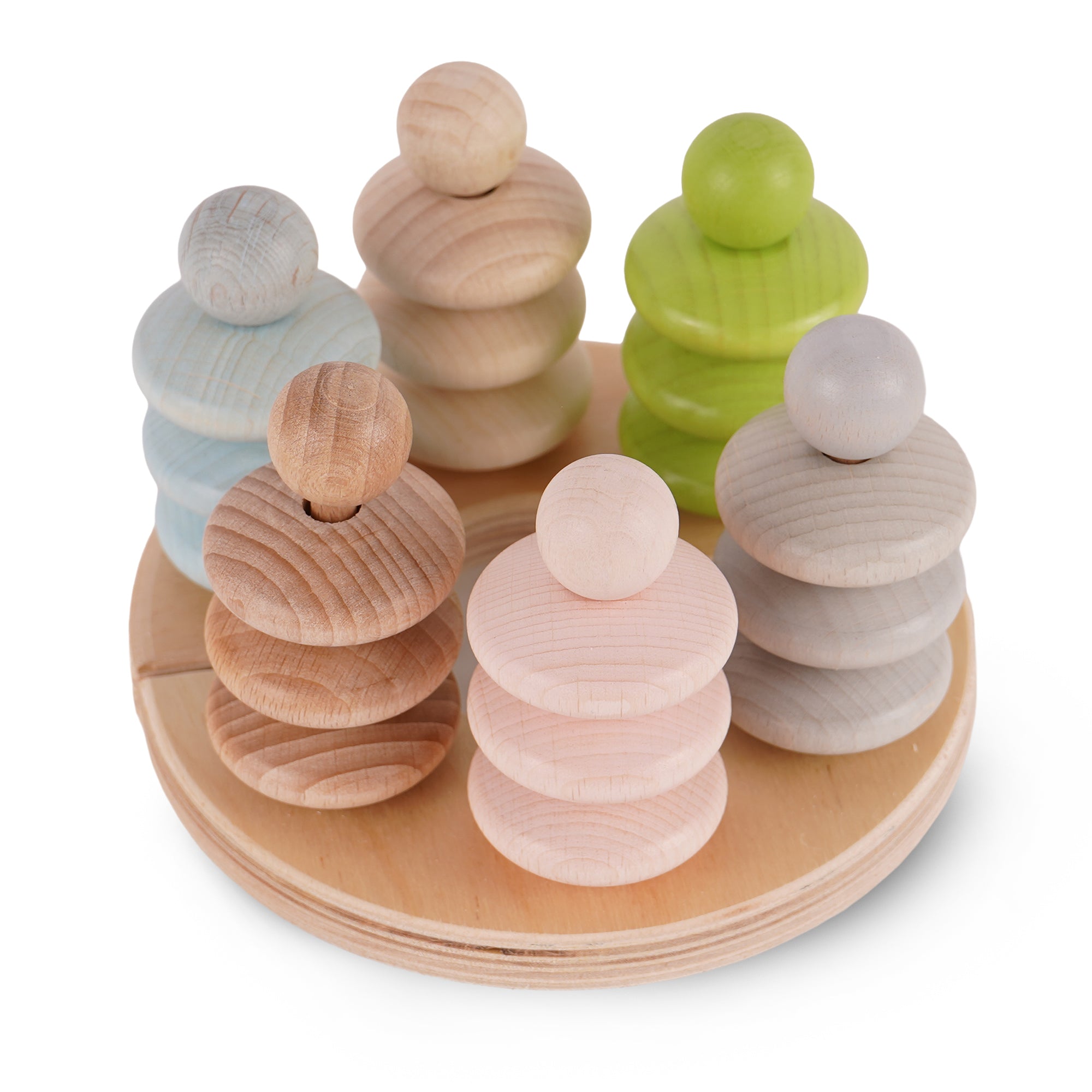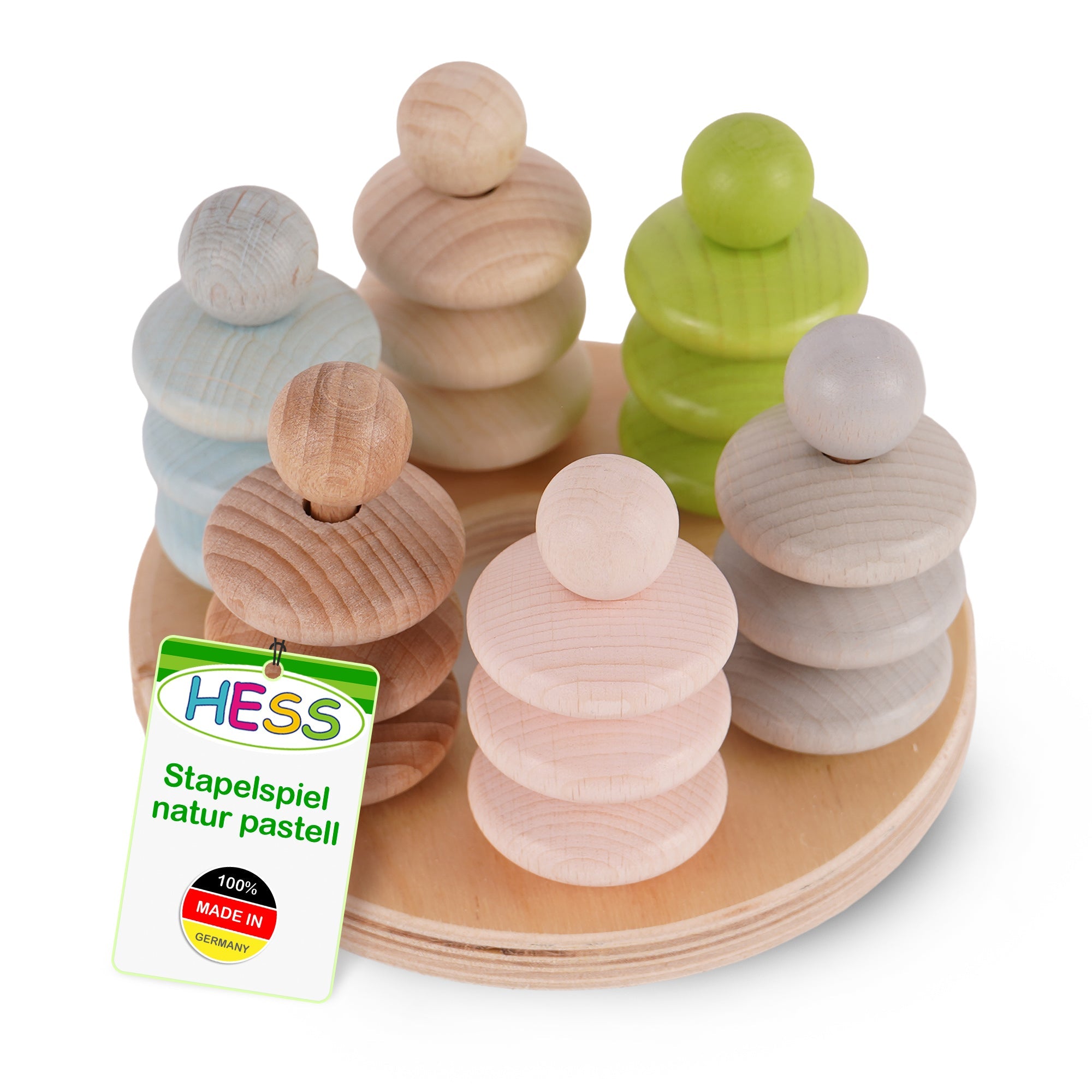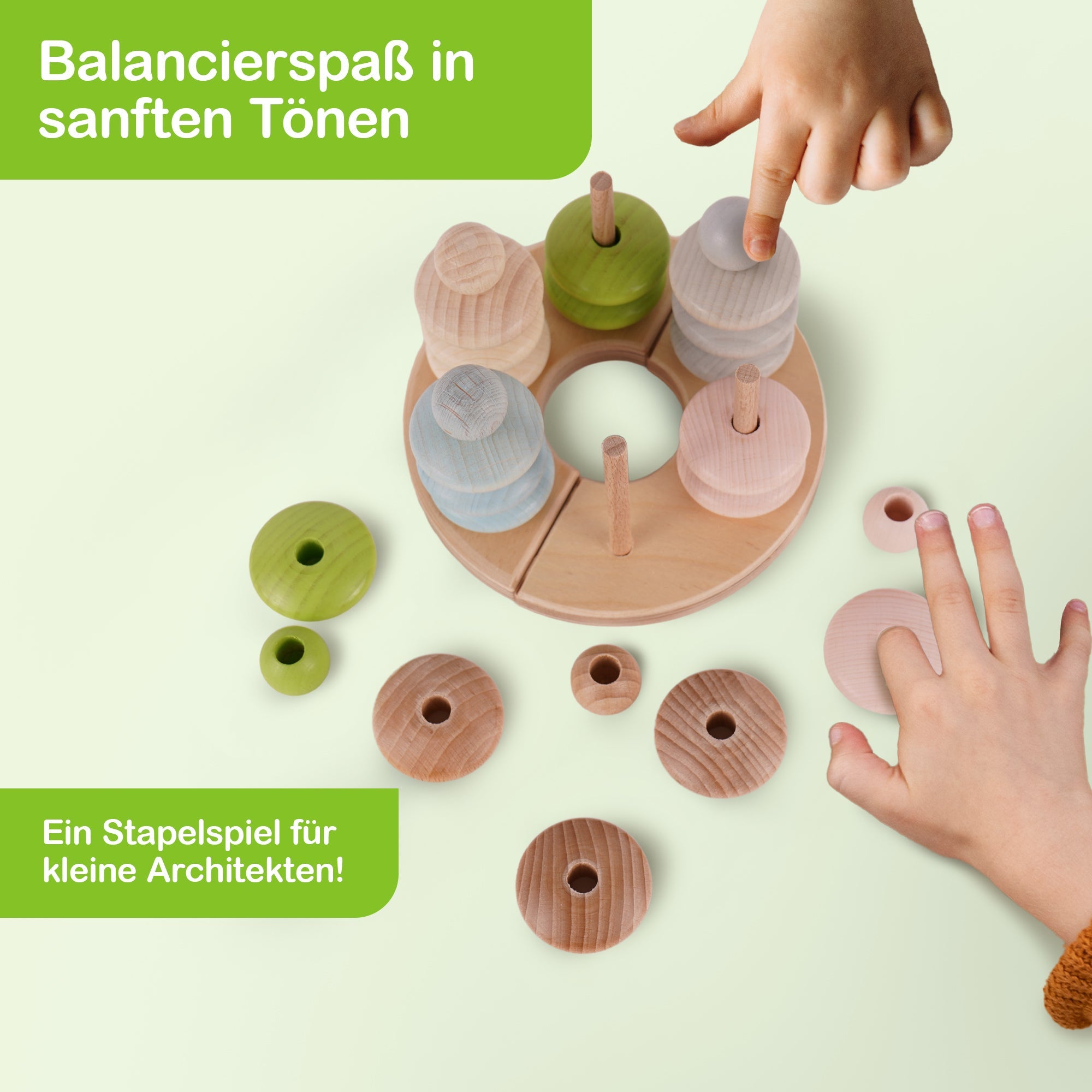 The stacking game with 6 towers in different pastel colors is a high-quality wooden toy made in the Ore Mountains . By using sturdy and durable wood, this game guarantees a long service life , so children can spend many hours developing their motor skills while having fun.