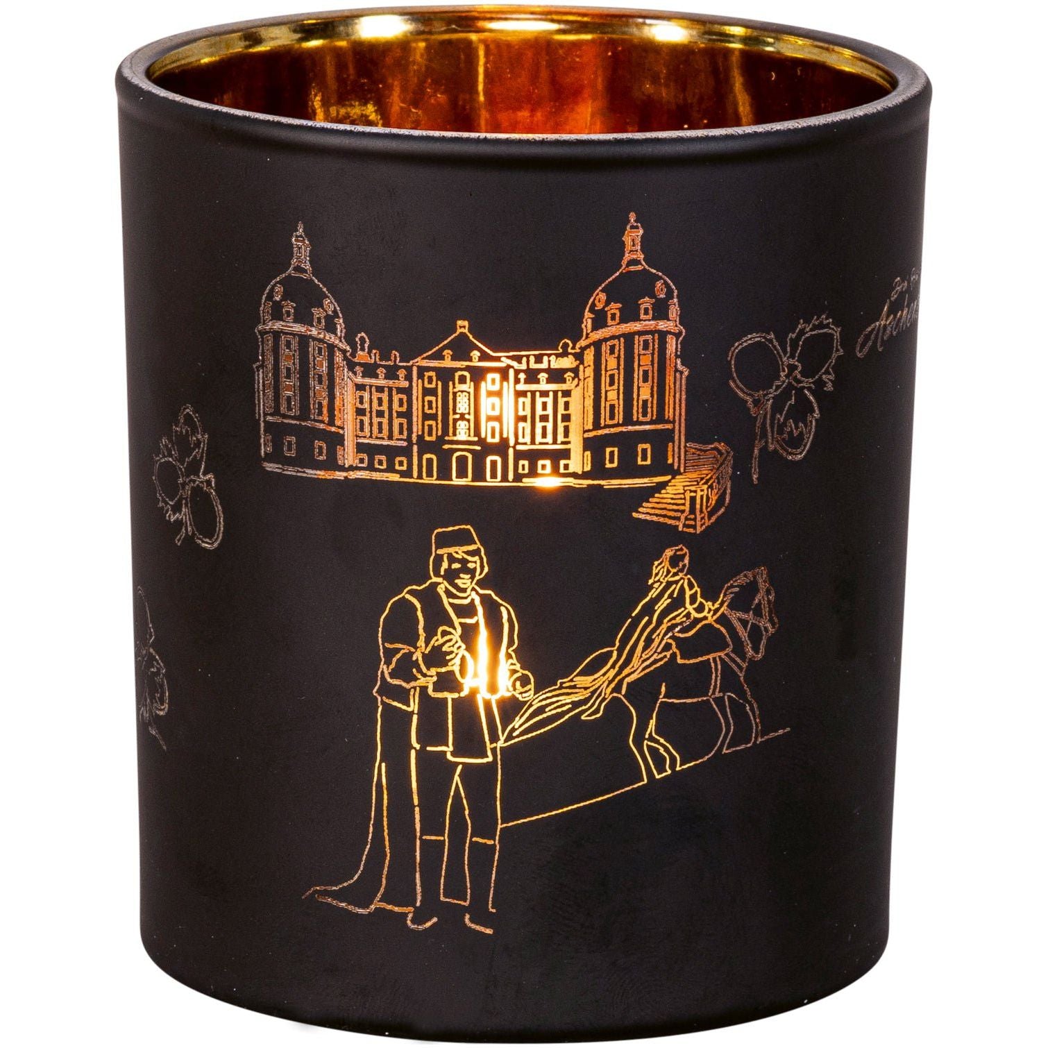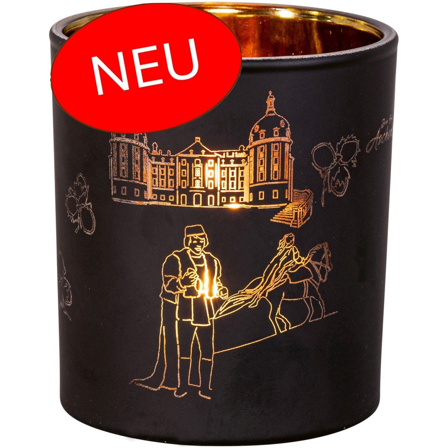Dieses wunderschöne Dekoglas für ein Teelicht zeigt den Prinz mit Aschenbrödels verlorenen Schuh in der Hand, während Aschenbrödel auf ihrem Pferd Nikolaus davonreitet. Im Hintergrund sieht man das prachtvolle Schloss Moritzburg. Die Szene strahlt eine märchenhafte Atmosphäre aus und lädt zum Träumen ein.
