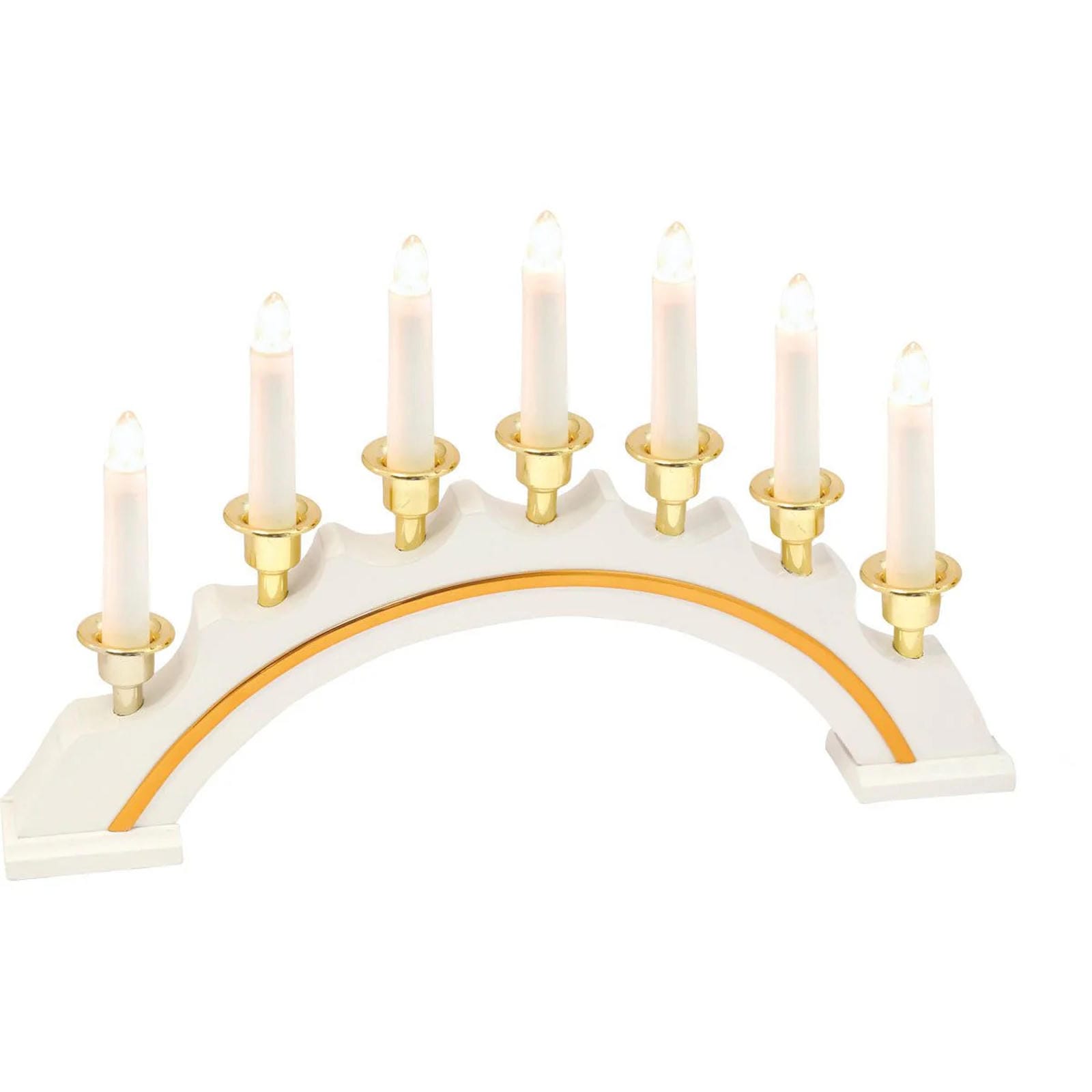 The high-quality Swedish candlestick made of wood with golden design accents is a special arch of lights. The 7-flame lighting that almost looks like real candle lights and arranged in a stylish, semi-circular shape , they provide a warm and extremely atmospheric light in your window.