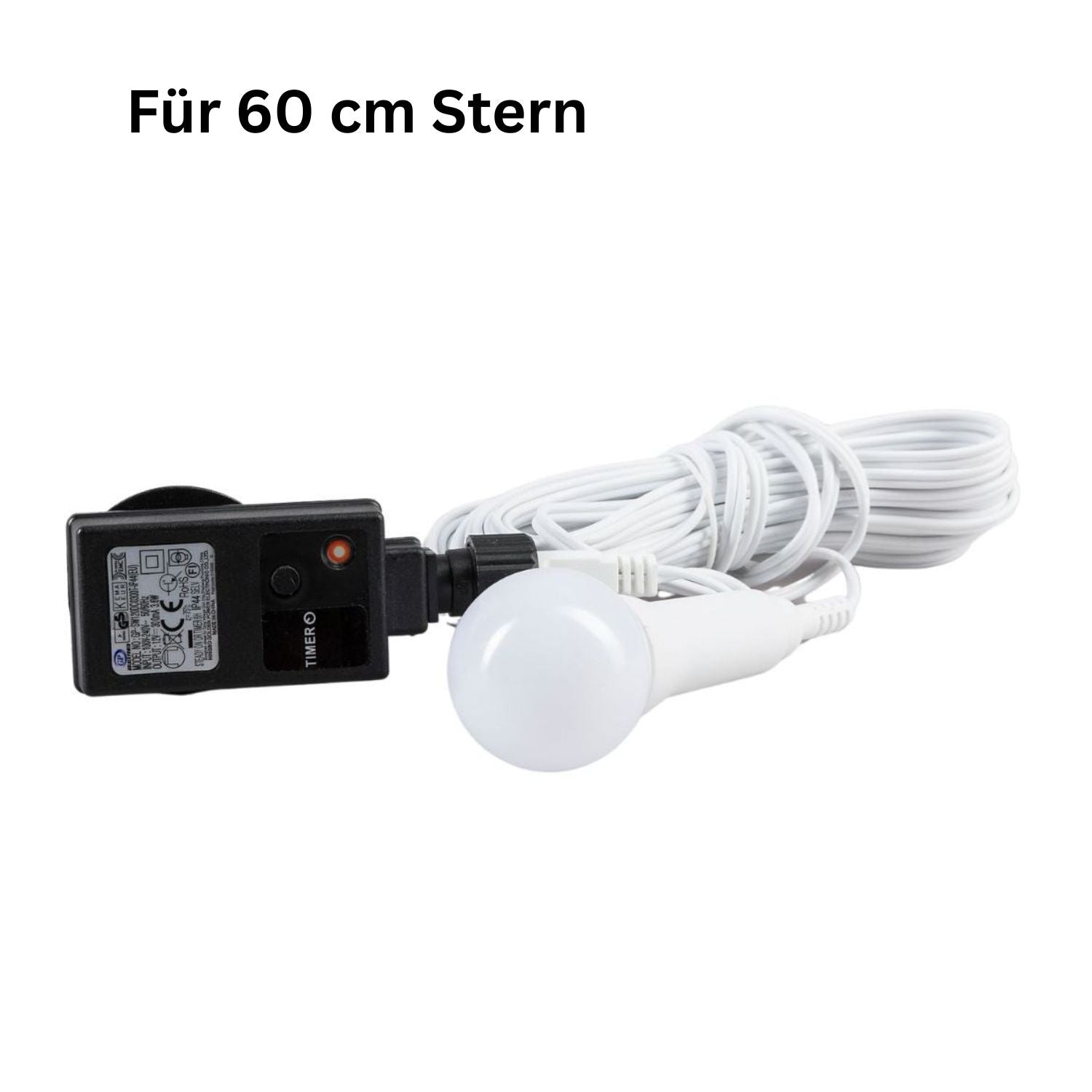 Are you looking for replacement lighting for your Ø 60cm plastic star with LED lighting? This outdoor cable set comes to you including LED electrics, 6-hour timer and IP 44 transformer. The cable length is 7 meters. Please note that the bulb is not replaceable. With a little skill you can also use it to illuminate your old Advent star. The energy-saving timer function is particularly practical. If the star is switched on, it switches off automatically after 6 hours of operation. So you can go to bed with peace of mind. Many families also use programmable, glowing Advent stars as passive theft protection. This also makes them ideal for shop windows and shop decoration.