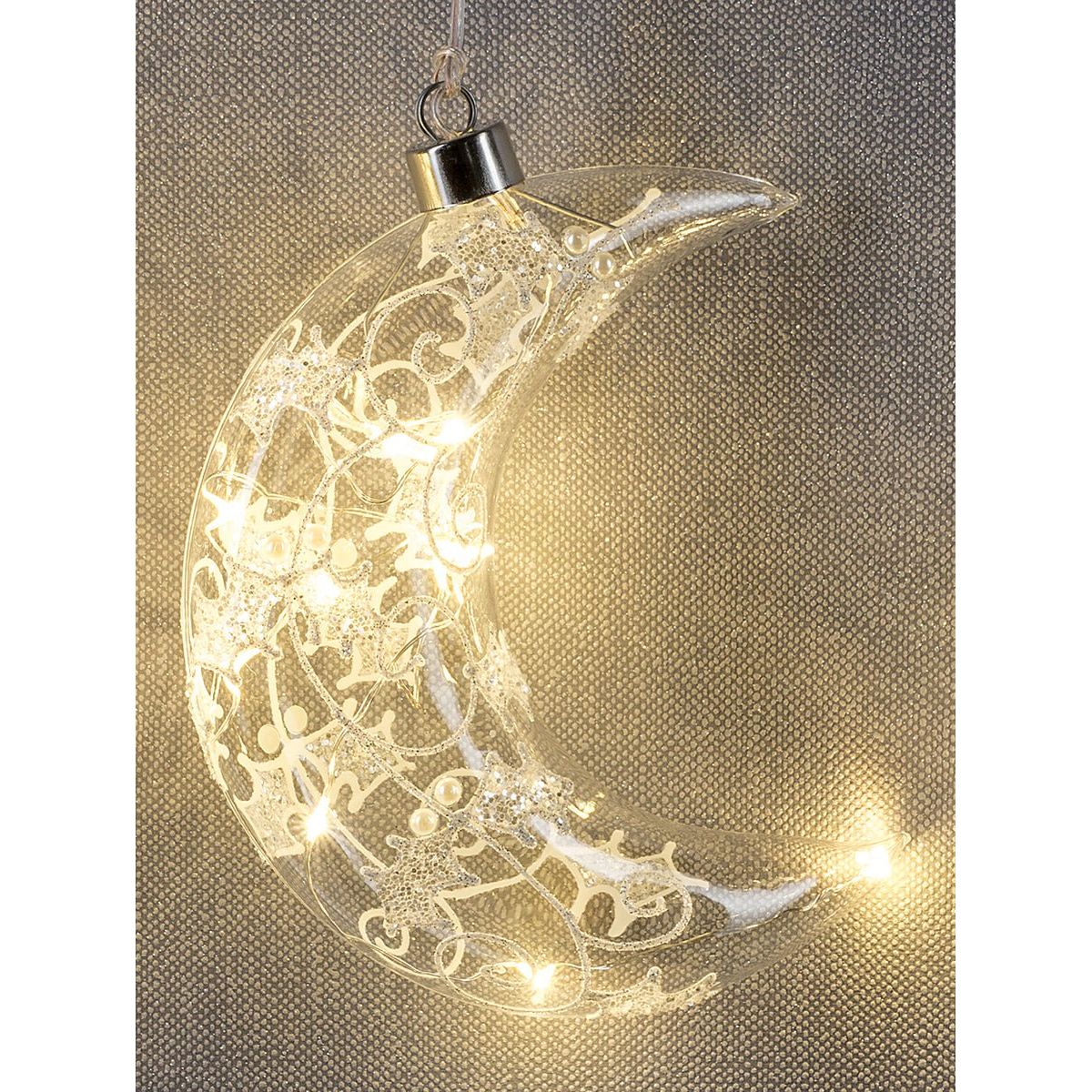 High-quality LED glass decoration with decor in crystal/frost look. The height of the glass moon is 16 cm. The glass moon is illuminated with an LED and is powered by a battery compartment hidden in the hanger. The glass decoration also has a timer function.