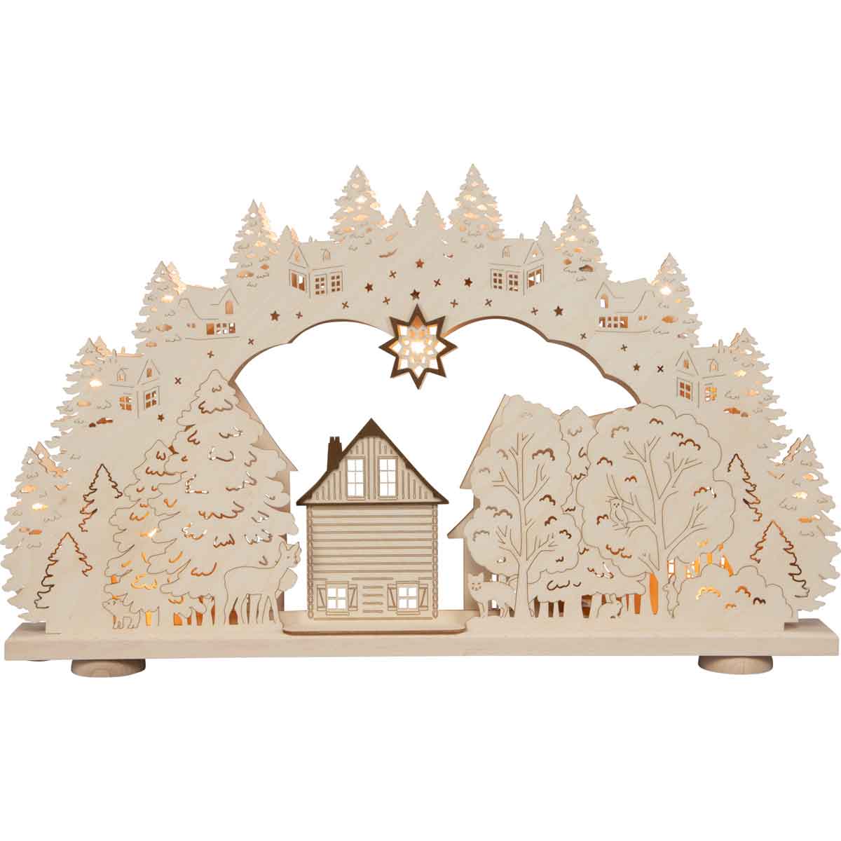 The LED light arch "Contrasts" is something very special. The front is kept dark and combined with the light back creates a wonderful contrast, as the name suggests. Together with the two figures that are included in delivery, this creates a strong 3D effect that immerses you in the entire scene. The candle arch is "Made in Germany" and is manufactured with the greatest care and effort so that it also lives up to the "quality from the Erzgebirge". The 15 LED-lamps provide indirect lighting and radiate a warm glow. You are guaranteed to have a lot of fun with this light arch, but it is precisely the two different contrasts, i.e. the bright back, that makes the candle arch very interesting for children. Have you already spotted the cute animals on the back hiding in the forest? This special feature also ensures that you can not only place the candle arch in the window, but that the candle arch also comes into its own in many other areas of your home.